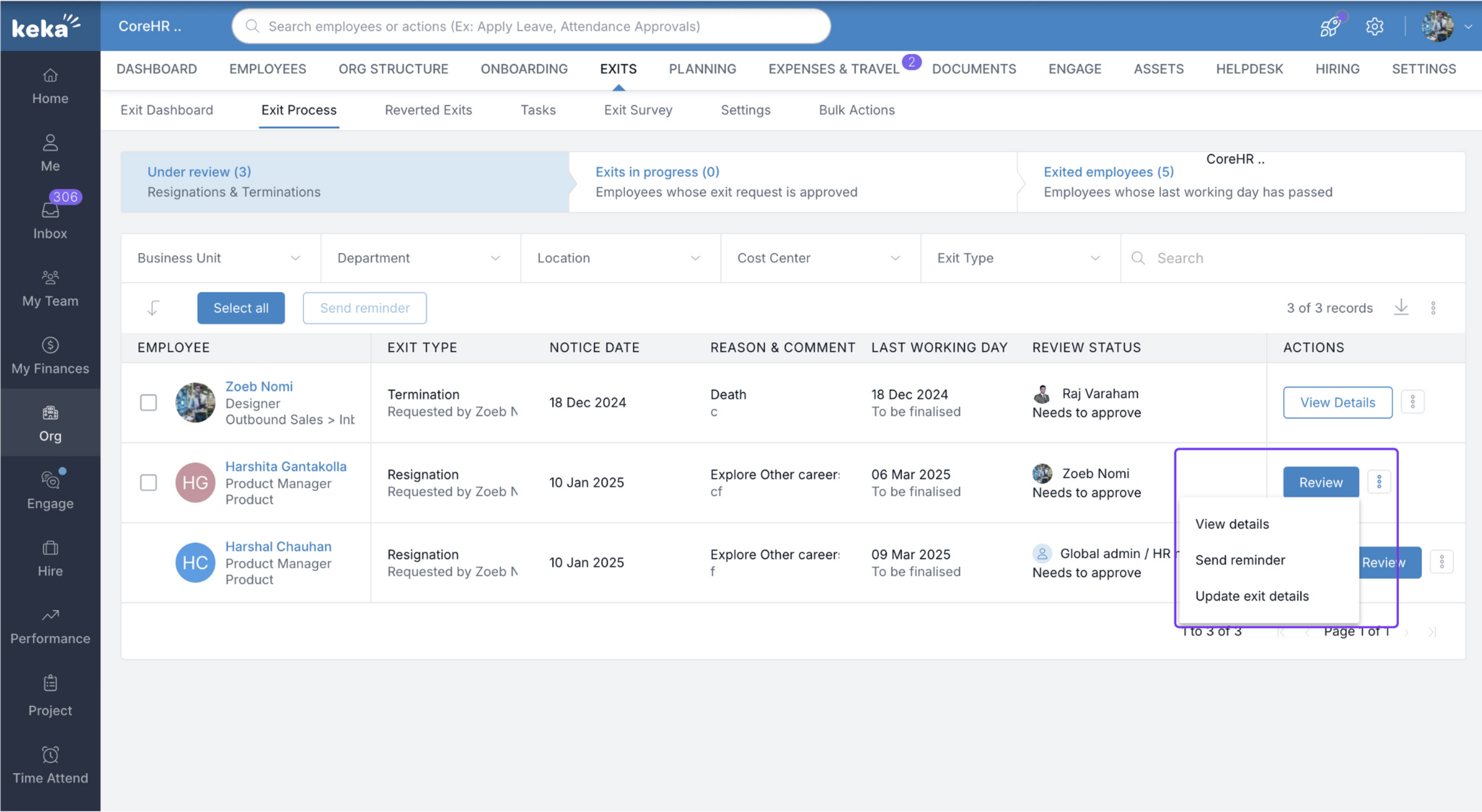 Three-Dot Menu: Here, you can view details, send a reminder to the approver, or update the exit details.