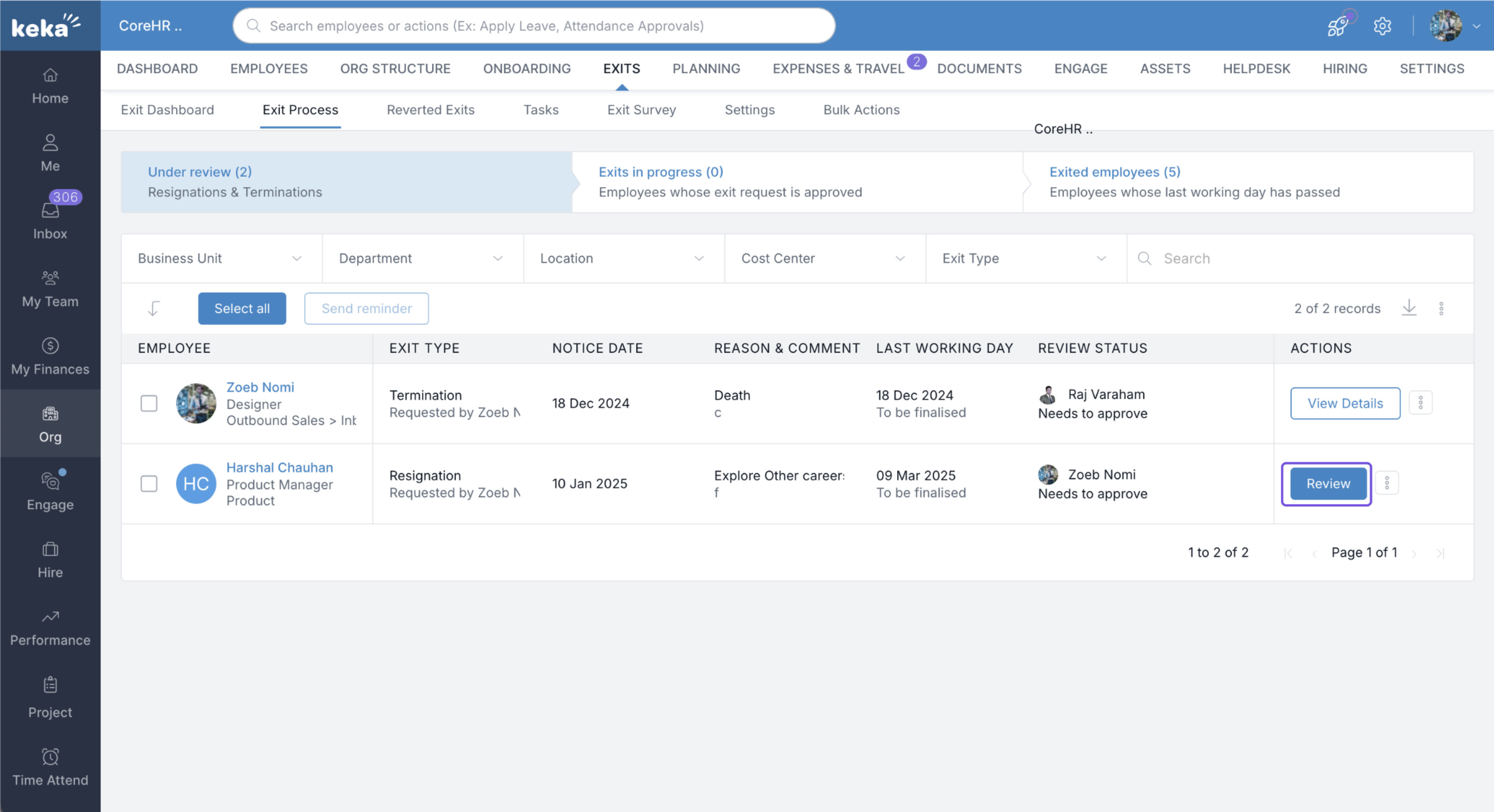 When an employee submits a resignation, the request will first appear in the Under-Review phase. In this tab, managers, HR, or global admins can review and process the resignation.