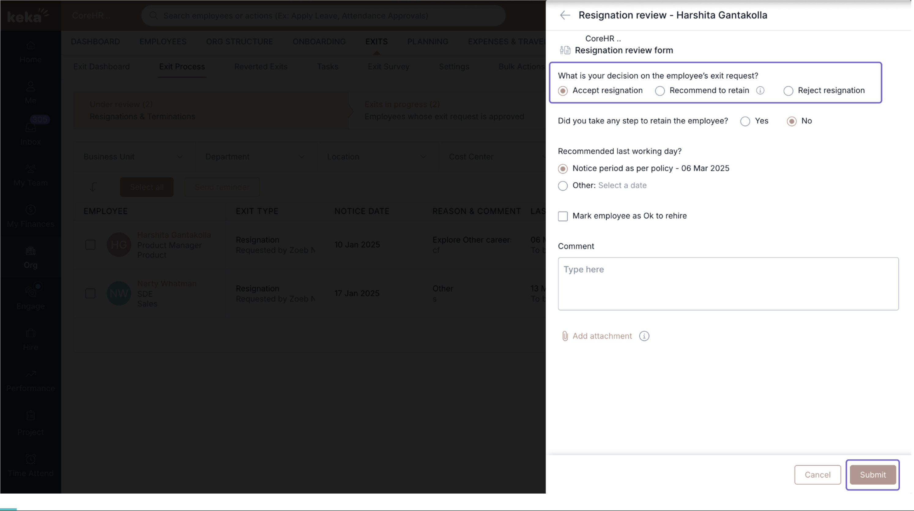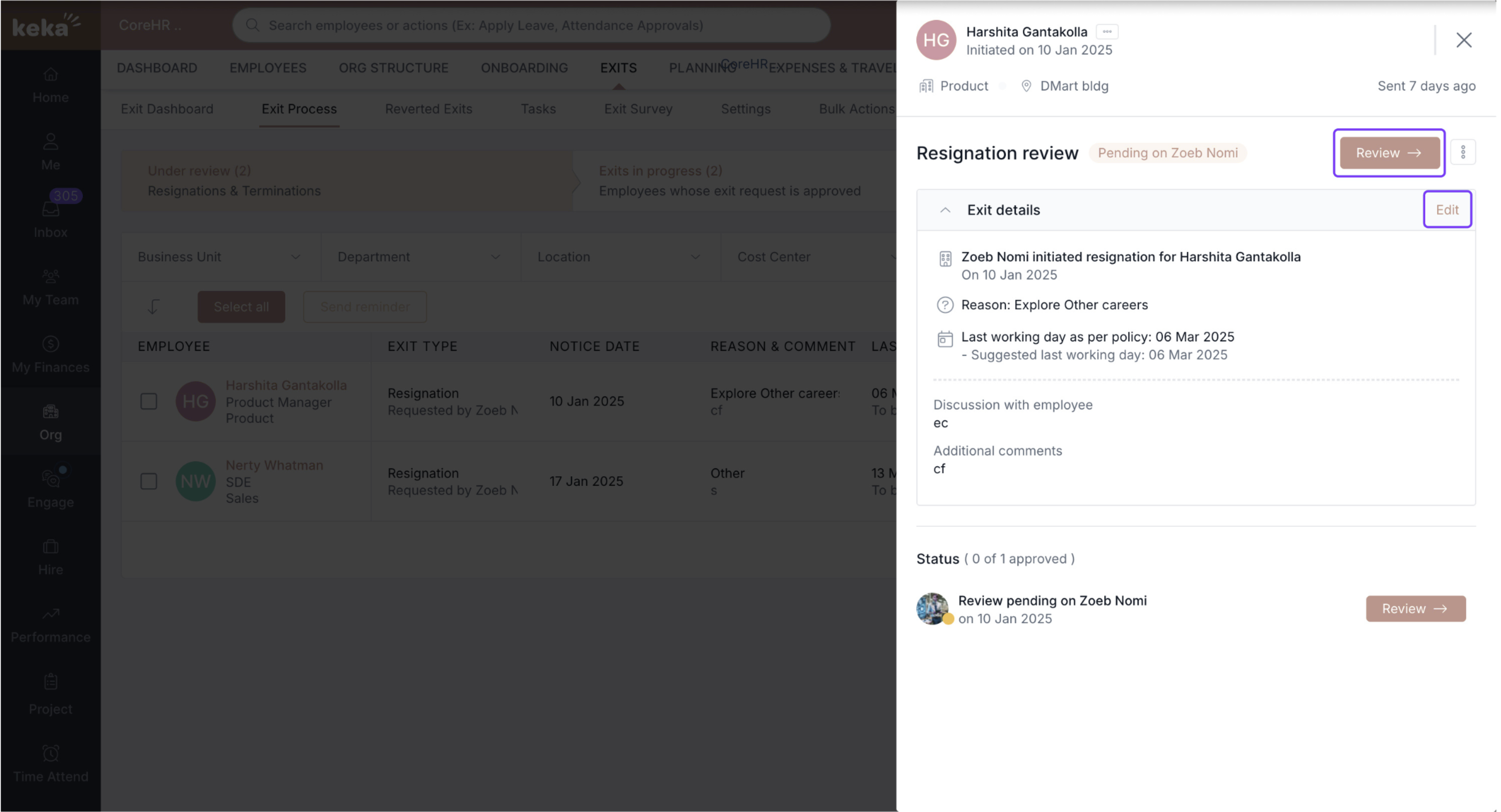 Once the review is completed, the resignation request will move to the Exit in Progress phase.