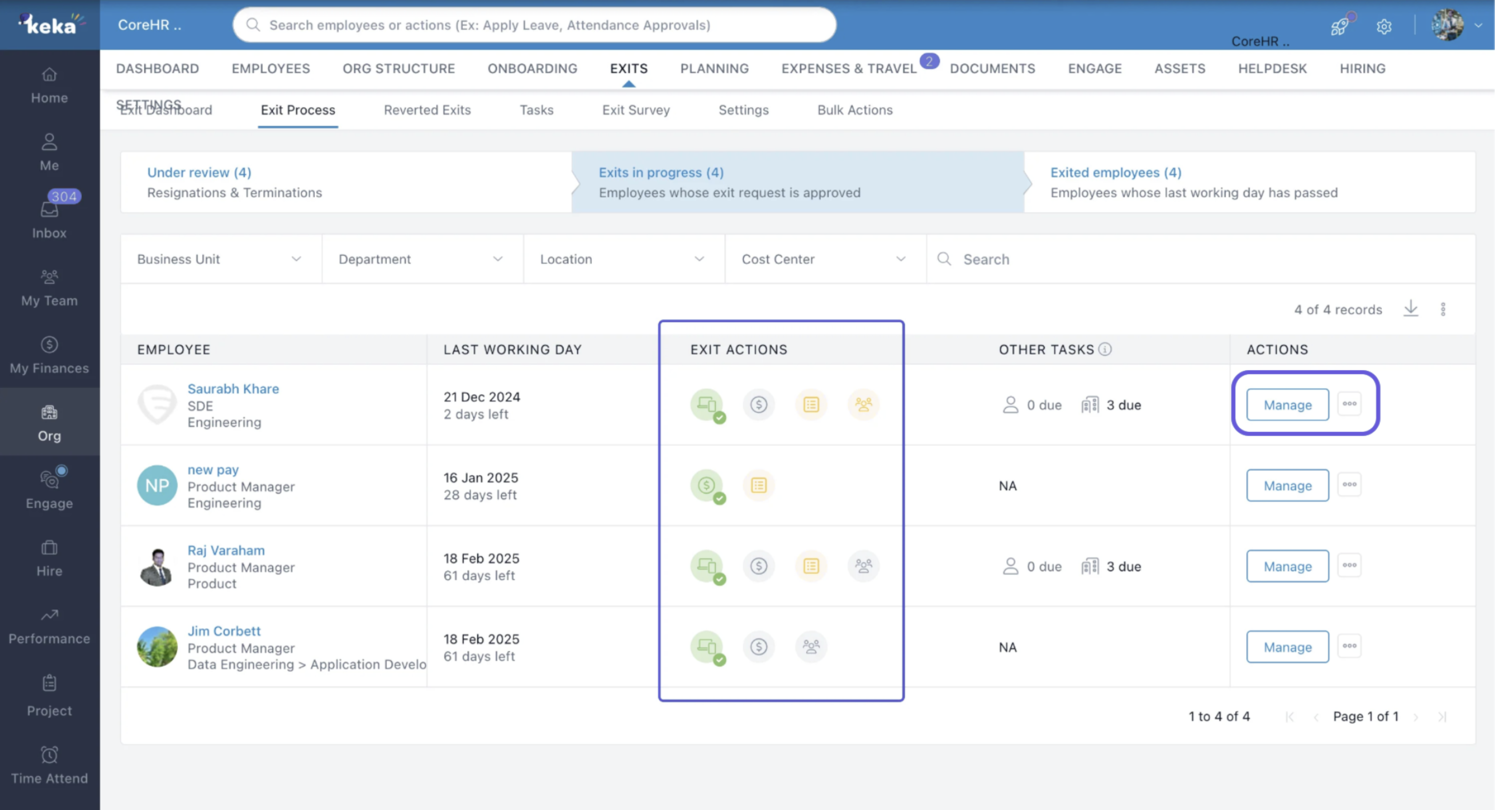 Once the resignation is accepted, the employee's exit process moves to the Exit in Progress phase. This section is organized into several parts that help manage the exit process effectively. Here, you can view the employee details and manage exit actions through icons, with statuses indicated by colours:
