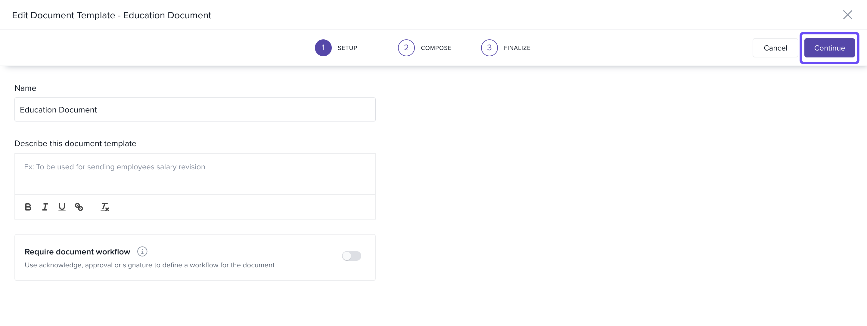 - In the Setup section, enter a Name and Description for the template, then click Continue to move to the next section.