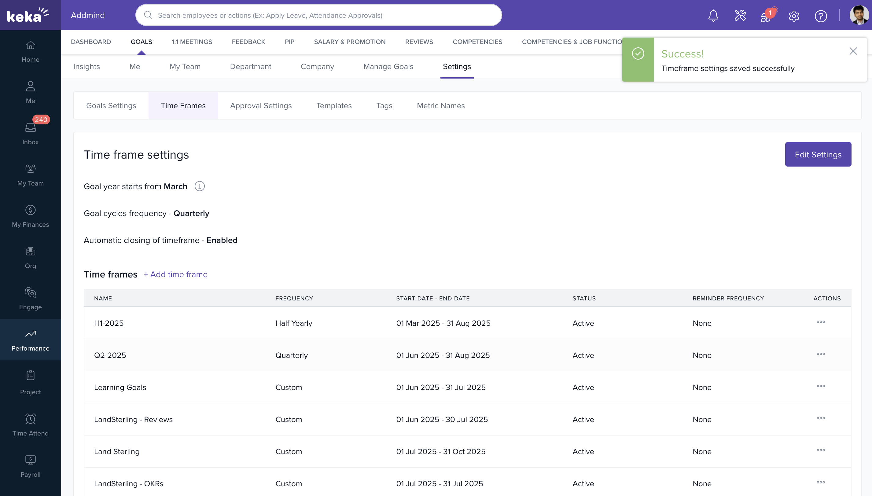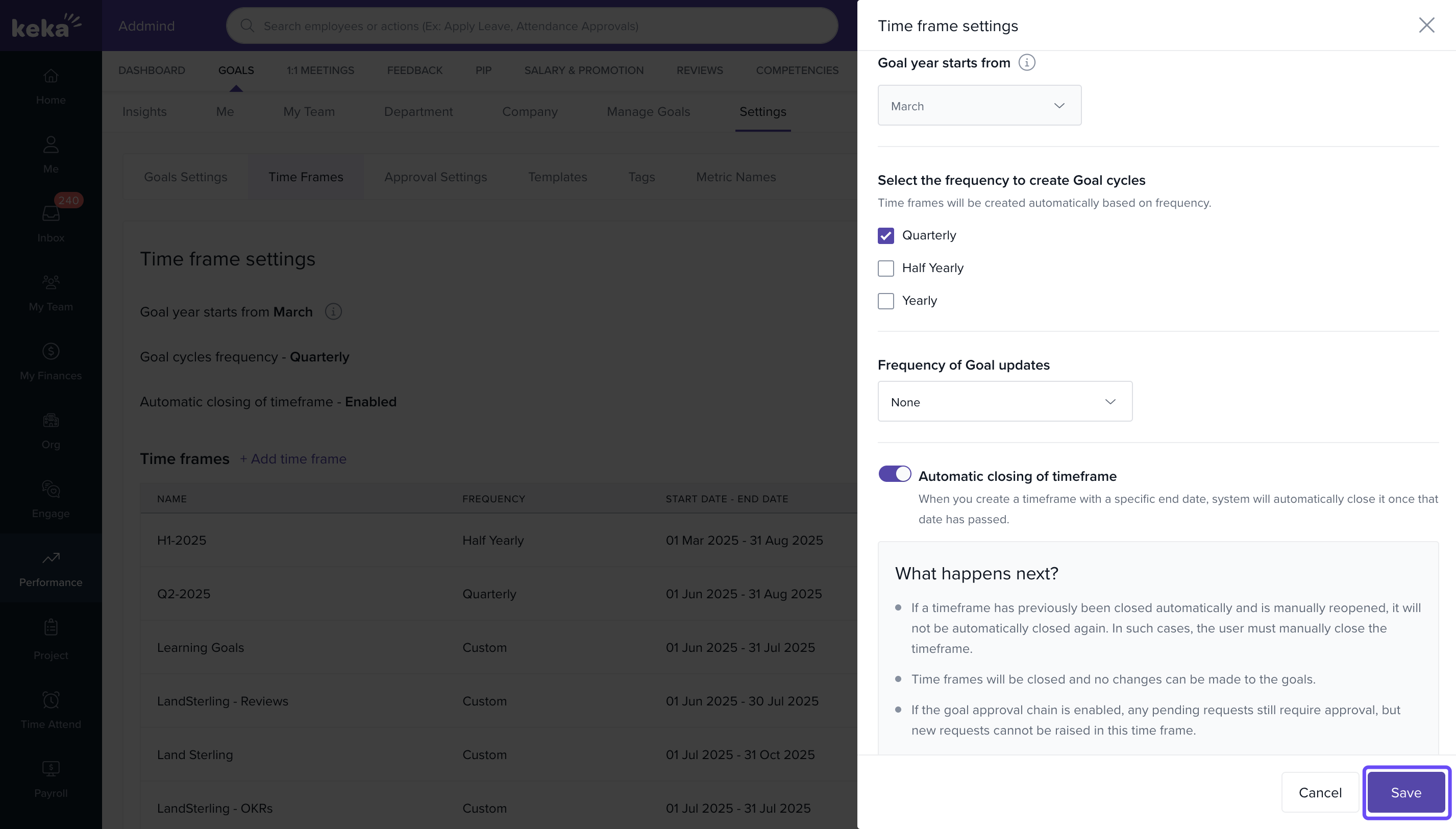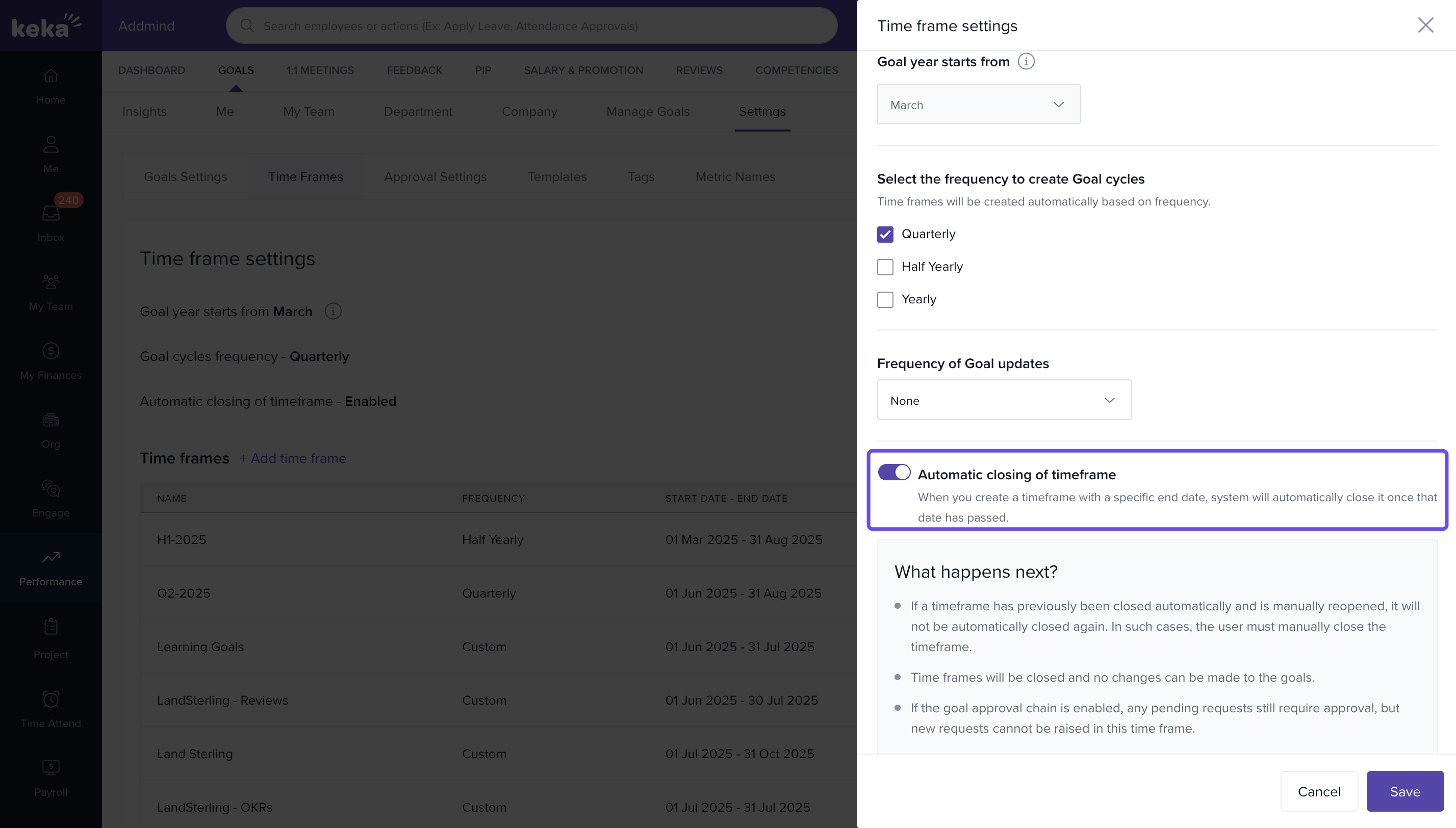 Previously, timeframes had to be closed manually after their end date. This often led to delays or oversights, allowing employees to continue editing goals even after the evaluation period was over. With this new feature, Keka automatically closes timeframes once the end date is reached—saving time and reducing errors.