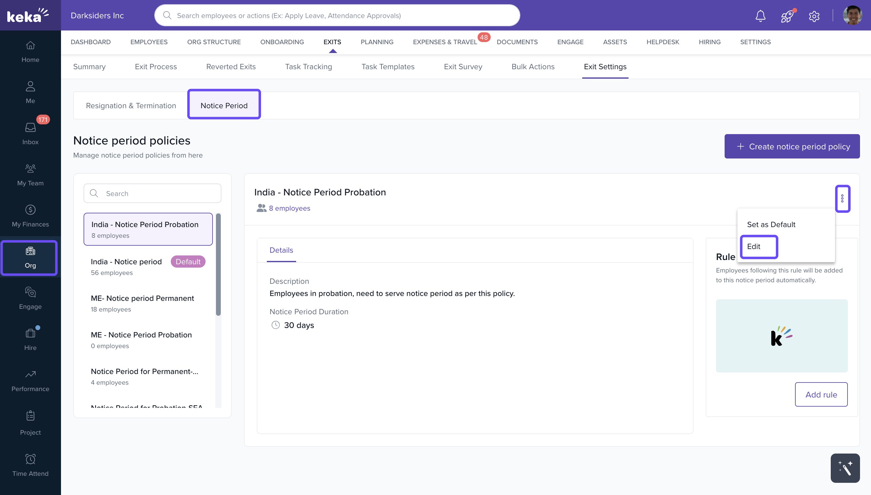 - Go to the Org > Exits > Settings > Notice Period.