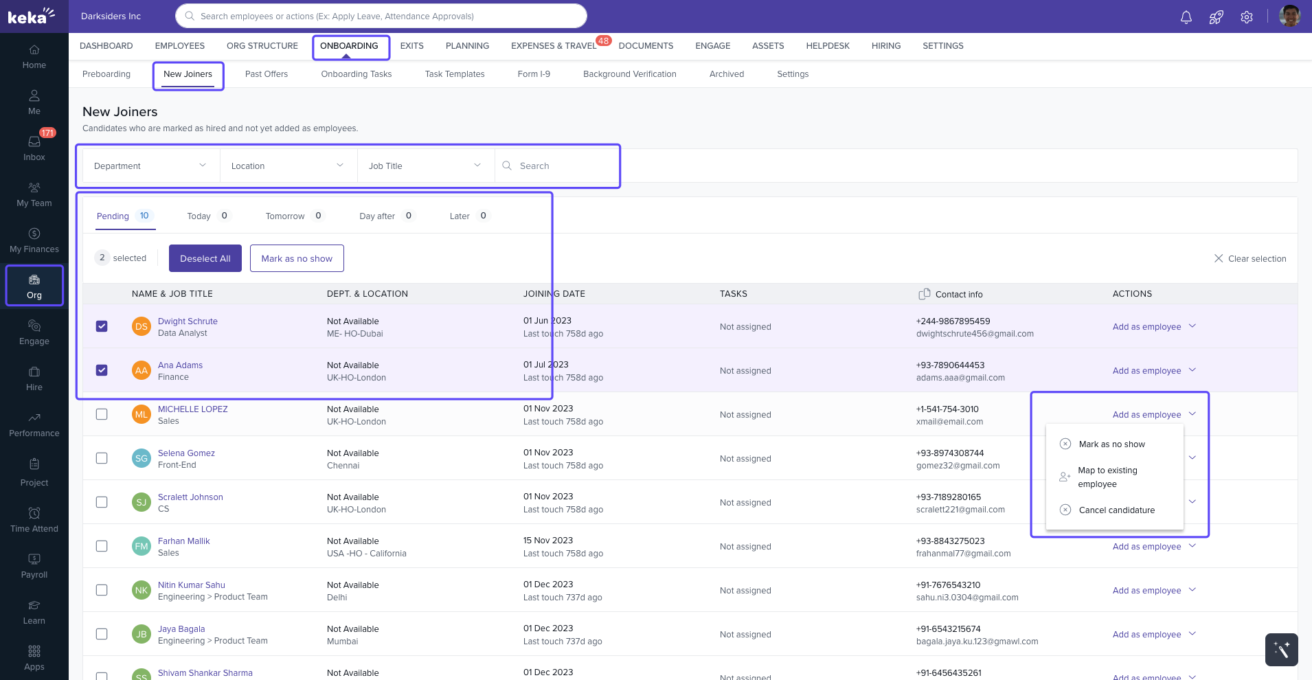 If a candidate doesn't report on their joining date, use this option to mark them as a No Show. This helps: