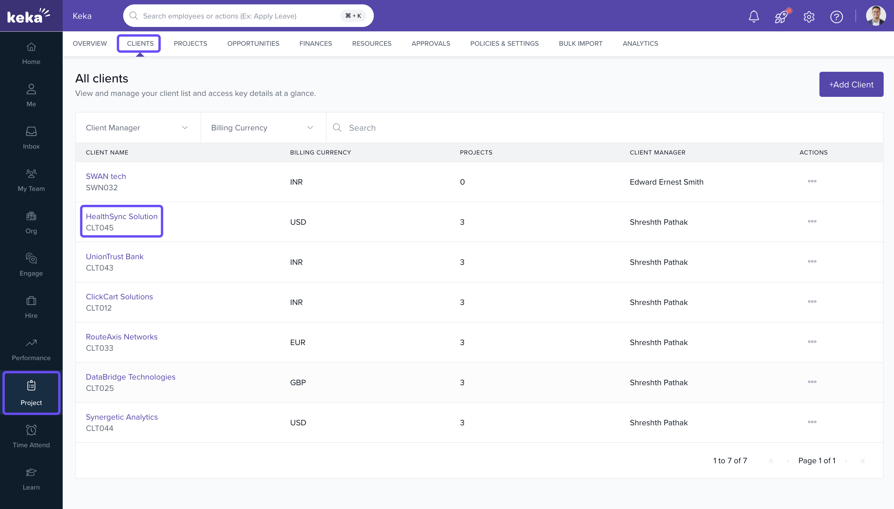 Shows client name, location, billing currency, and status. -
