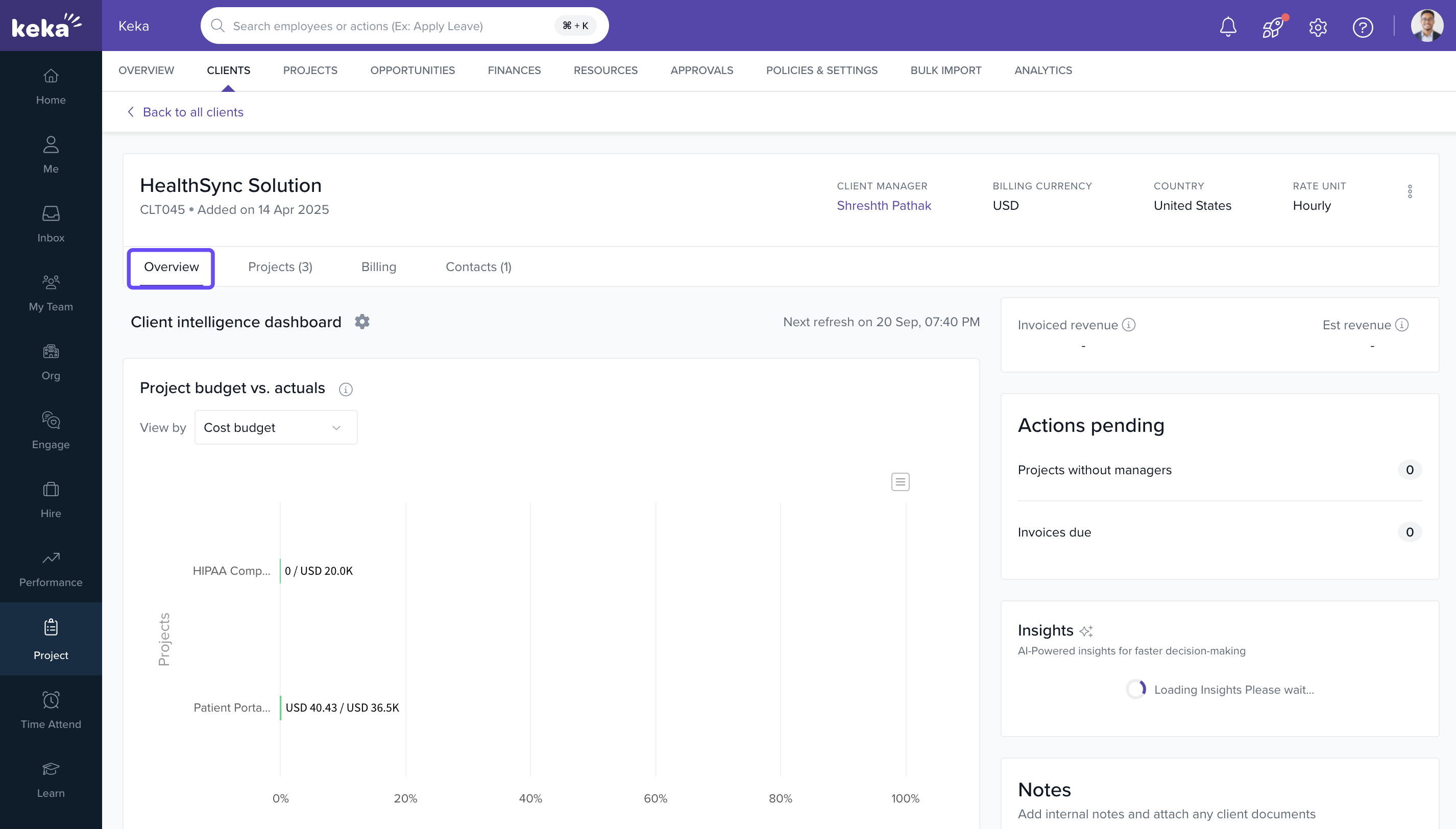 The client overview in Keka PSA provides a consolidated view of all activities related to a client—such as active projects, billable hours, invoices, and rate cards. It helps administrators and project managers track engagement at a glance, monitor billing progress, and access all relevant client data from one place.