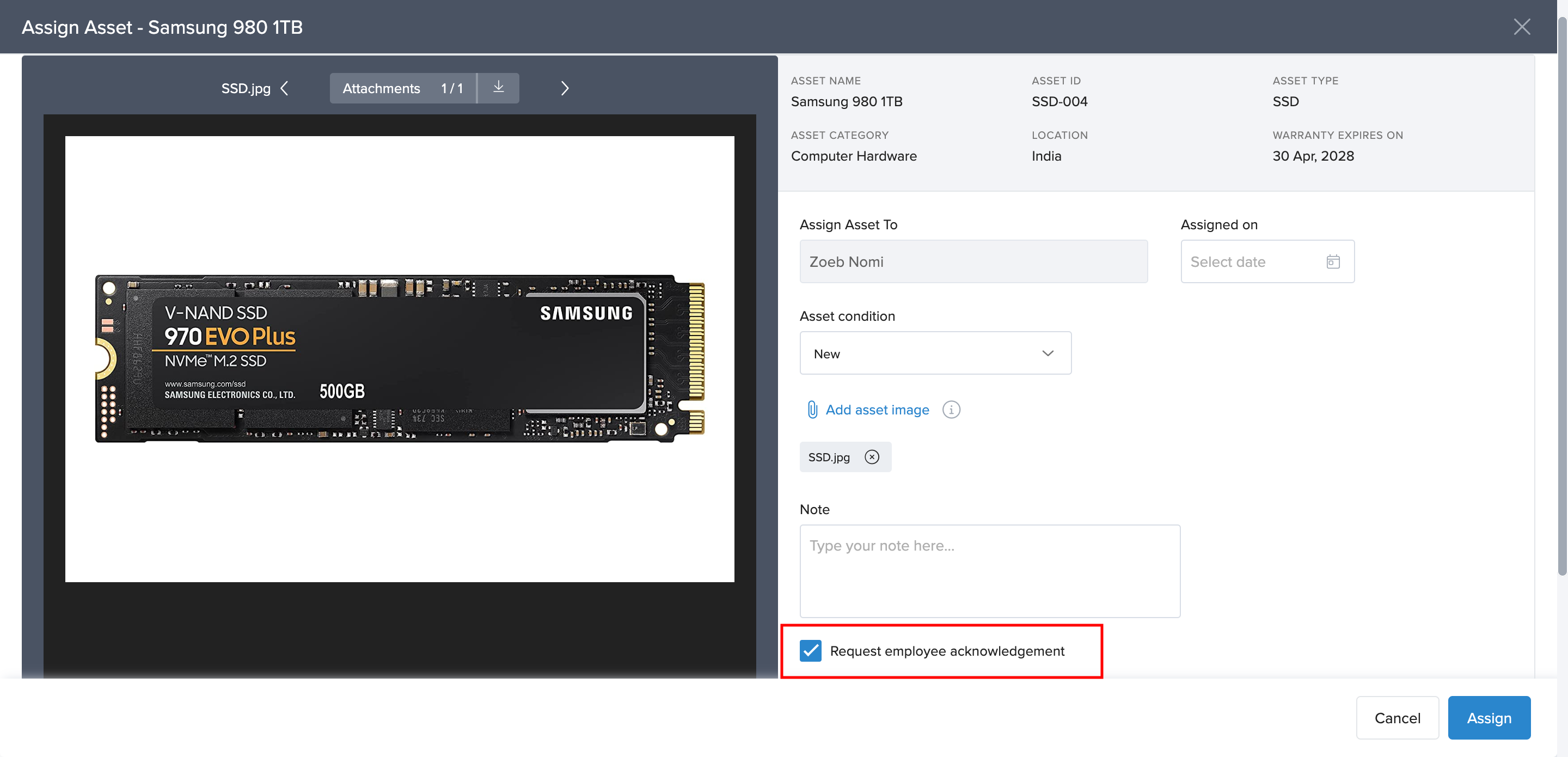 When assigning an asset in Keka, the Request Acknowledgement option is checked by default.