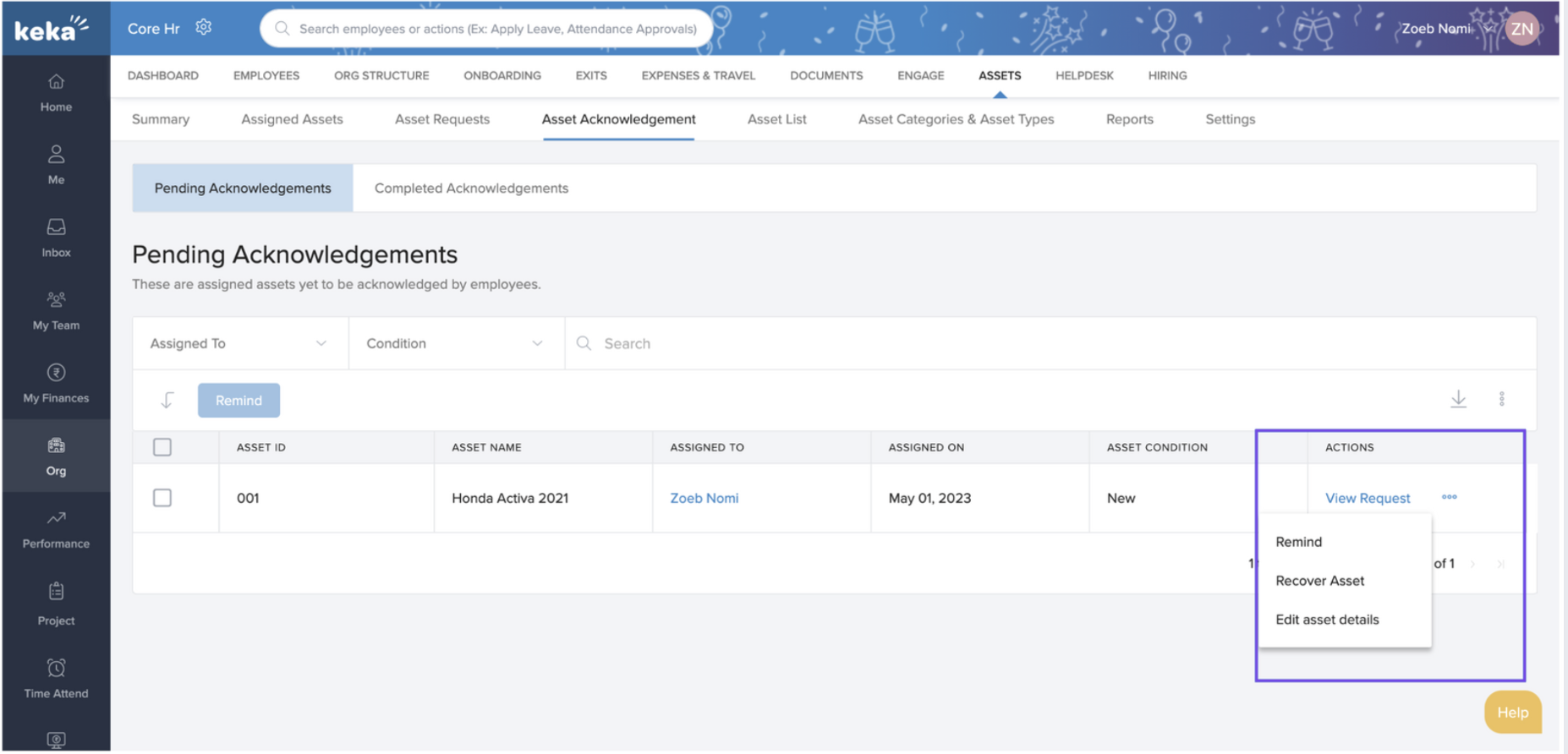 By using the Asset Acknowledgement feature in Keka, organizations can strengthen accountability, track pending confirmations, and maintain accurate records of asset ownership.
