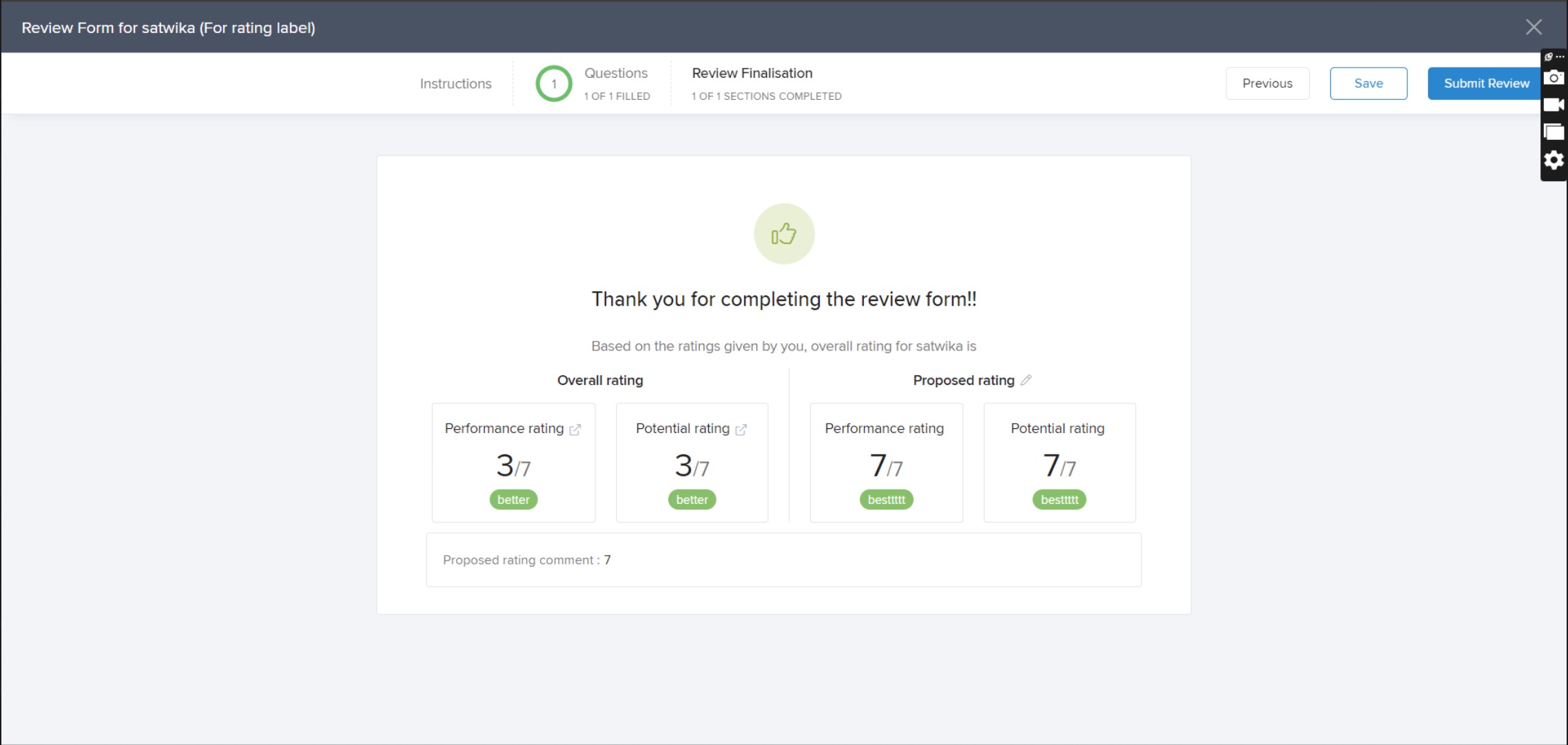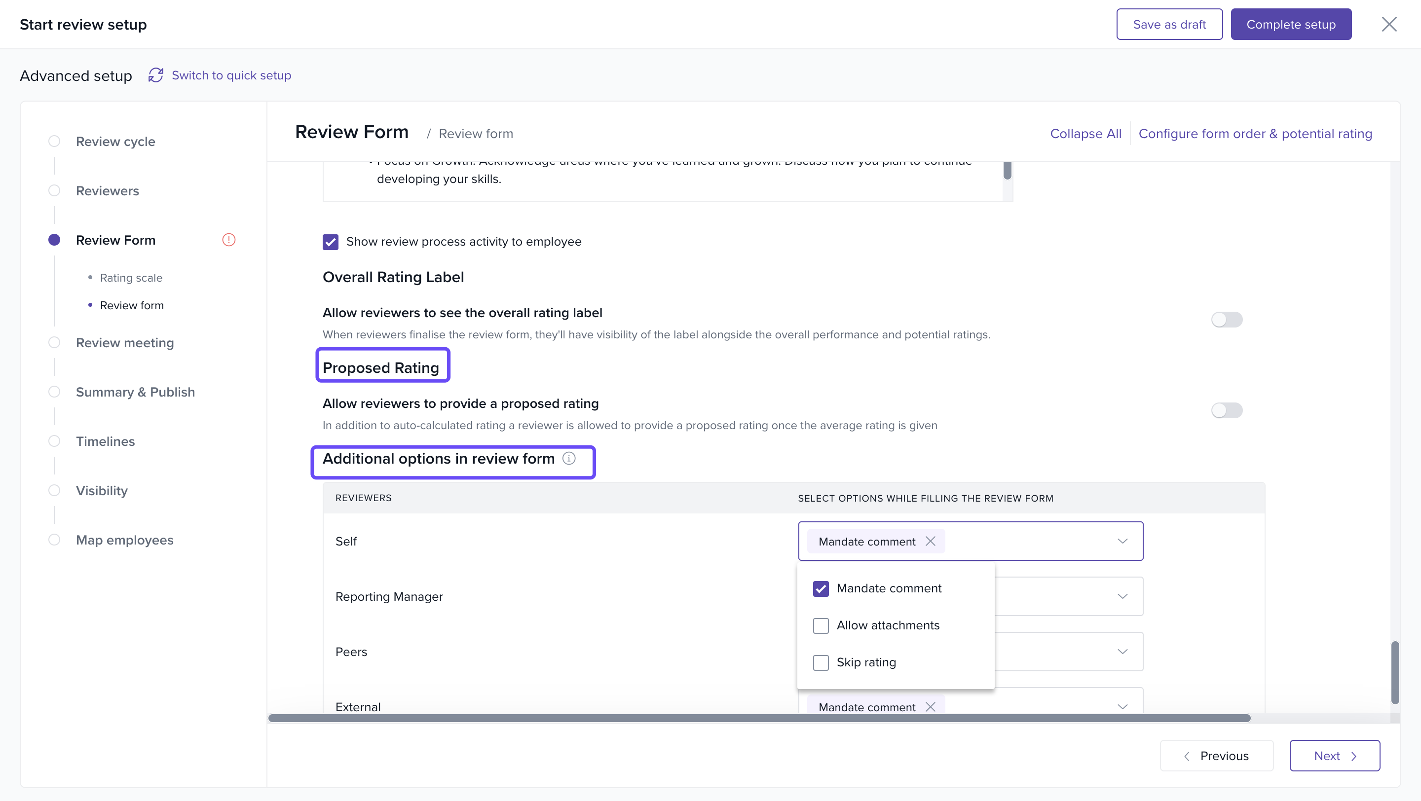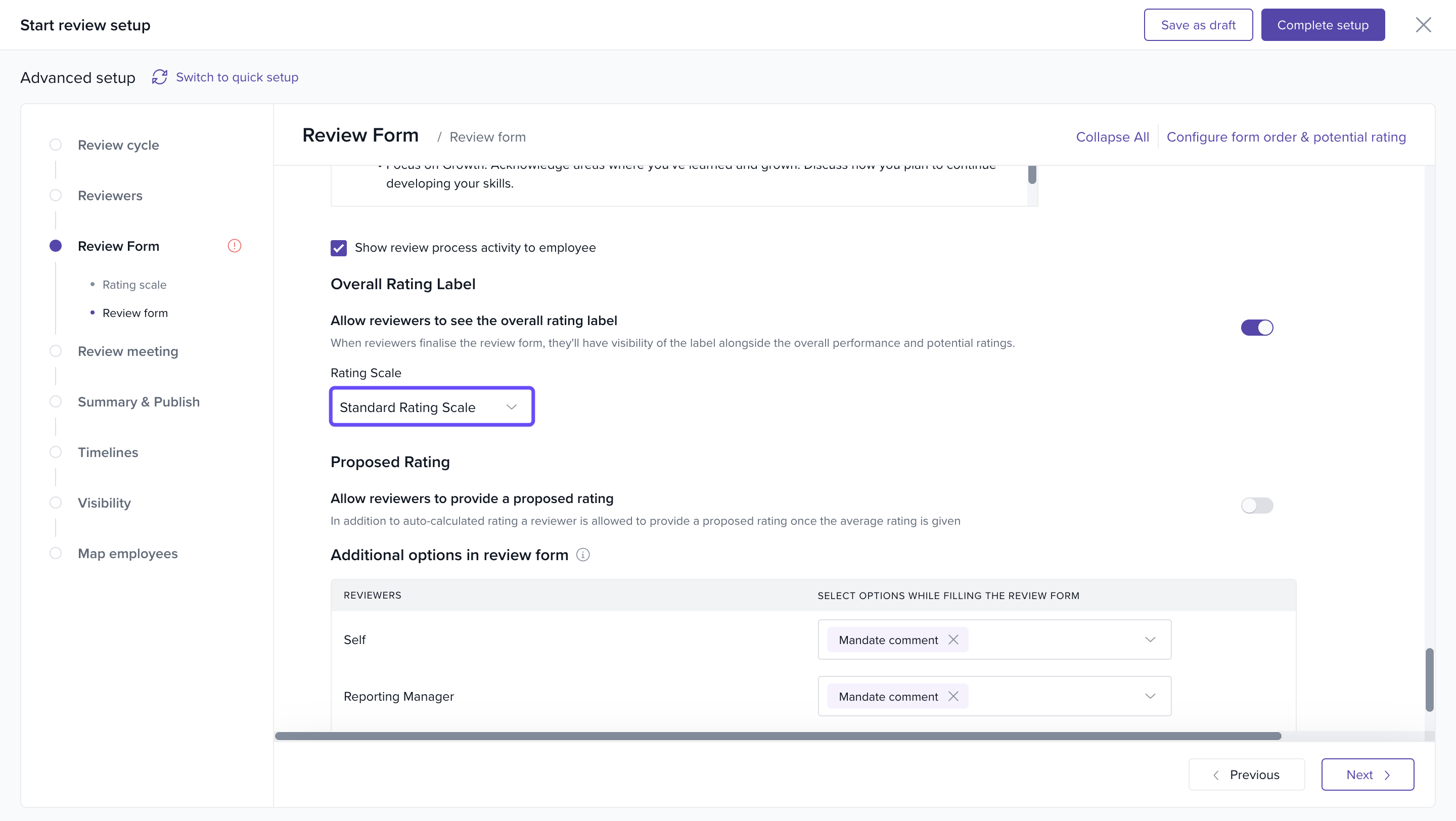 - If you want the reviewers to be able to suggest a rating different from the auto-calculated one, you can turn on the Proposed Rating feature. This feature enables a reviewer to offer a different overall rating for the employee. After that, you can choose who has the authority to finalise this proposed rating.