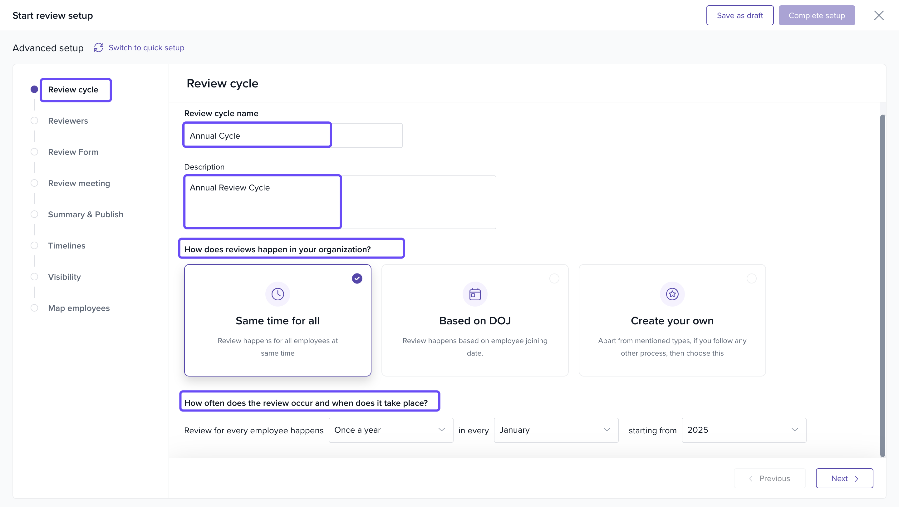 In the Advanced Setup option, you’ll begin by naming the review cycle and providing a brief description. From there, you can choose how reviews will occur in your organisation: