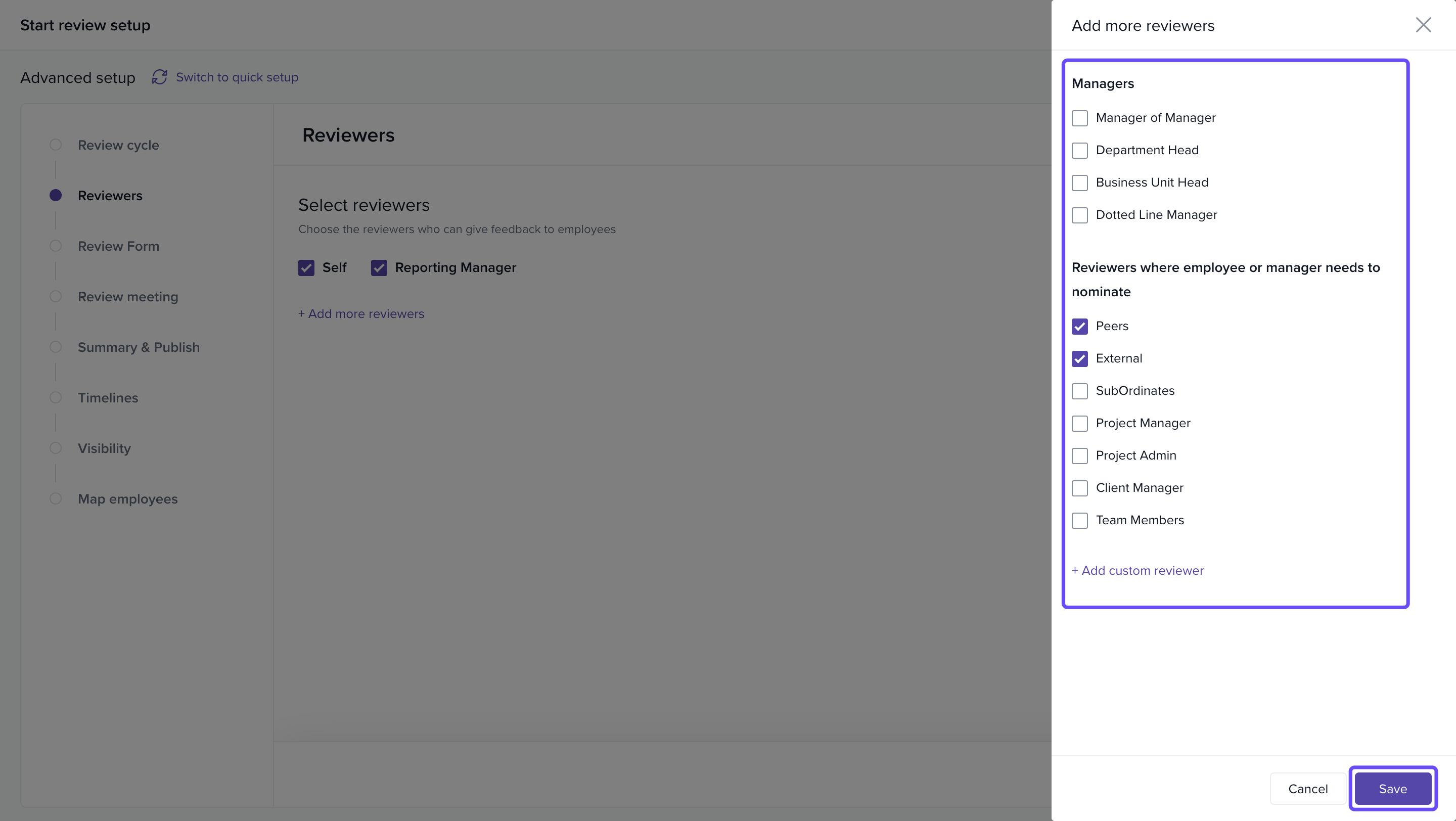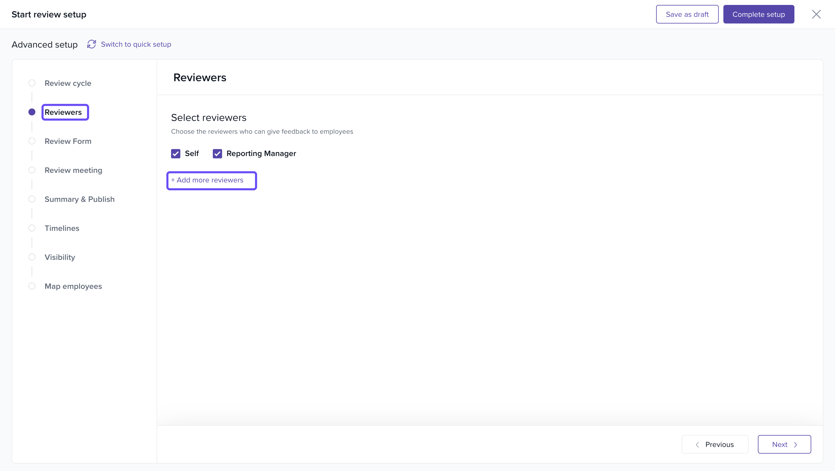 Now, it’s time to choose who will provide feedback on employee performance. By default, Self and Reporting Manager are selected as reviewers, but you can add more roles or specific individuals by clicking on +Add More Reviewers.