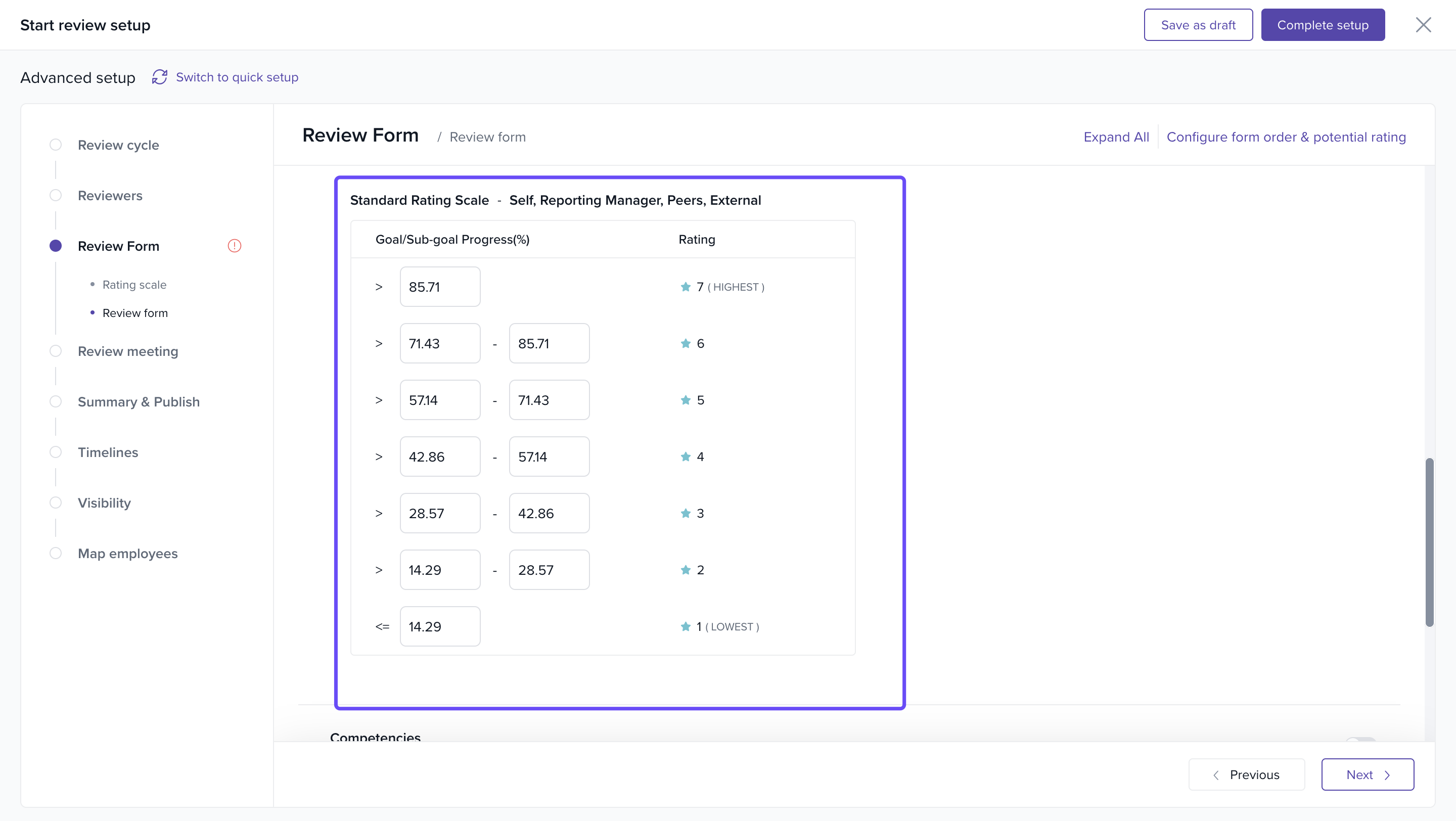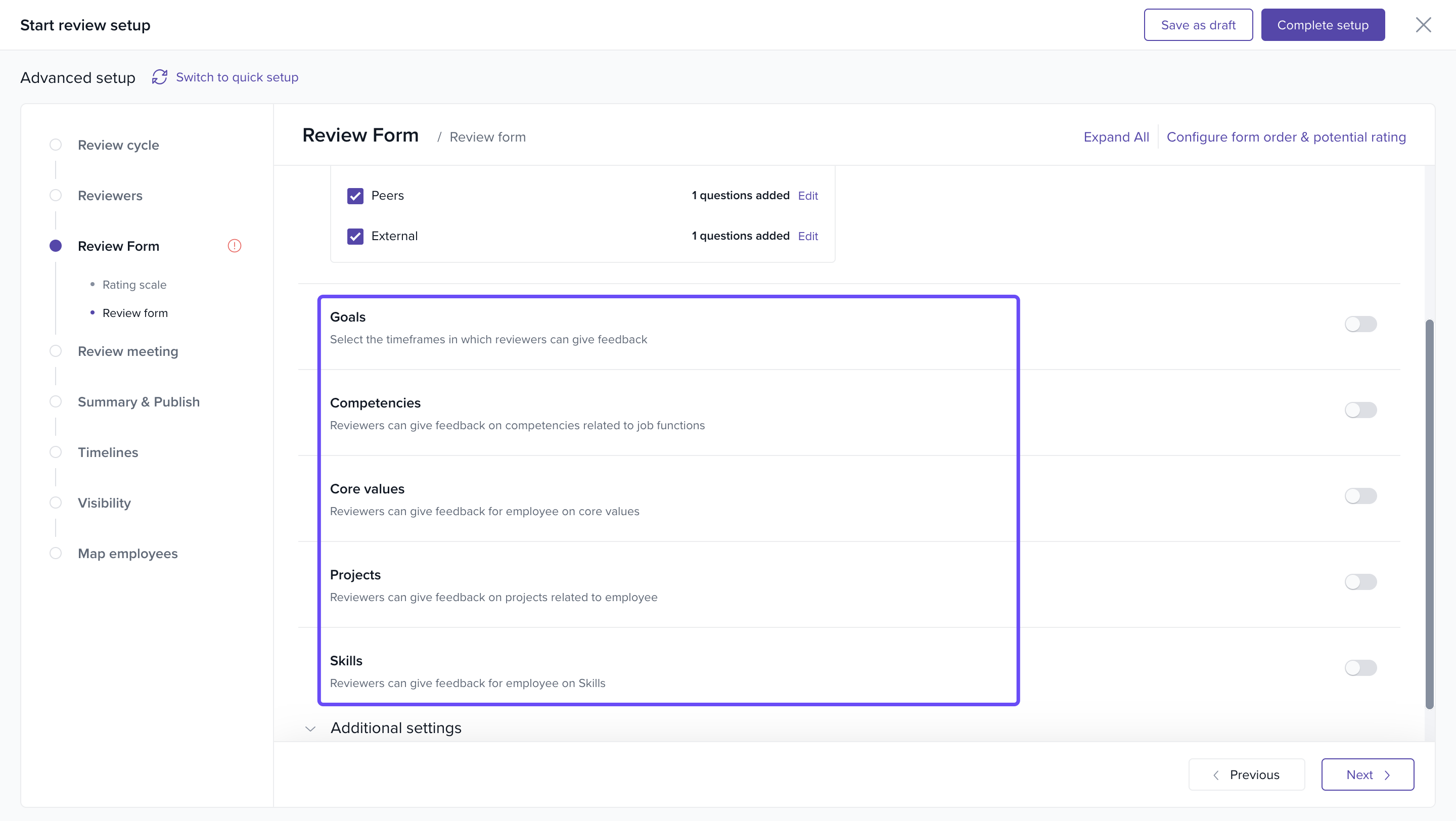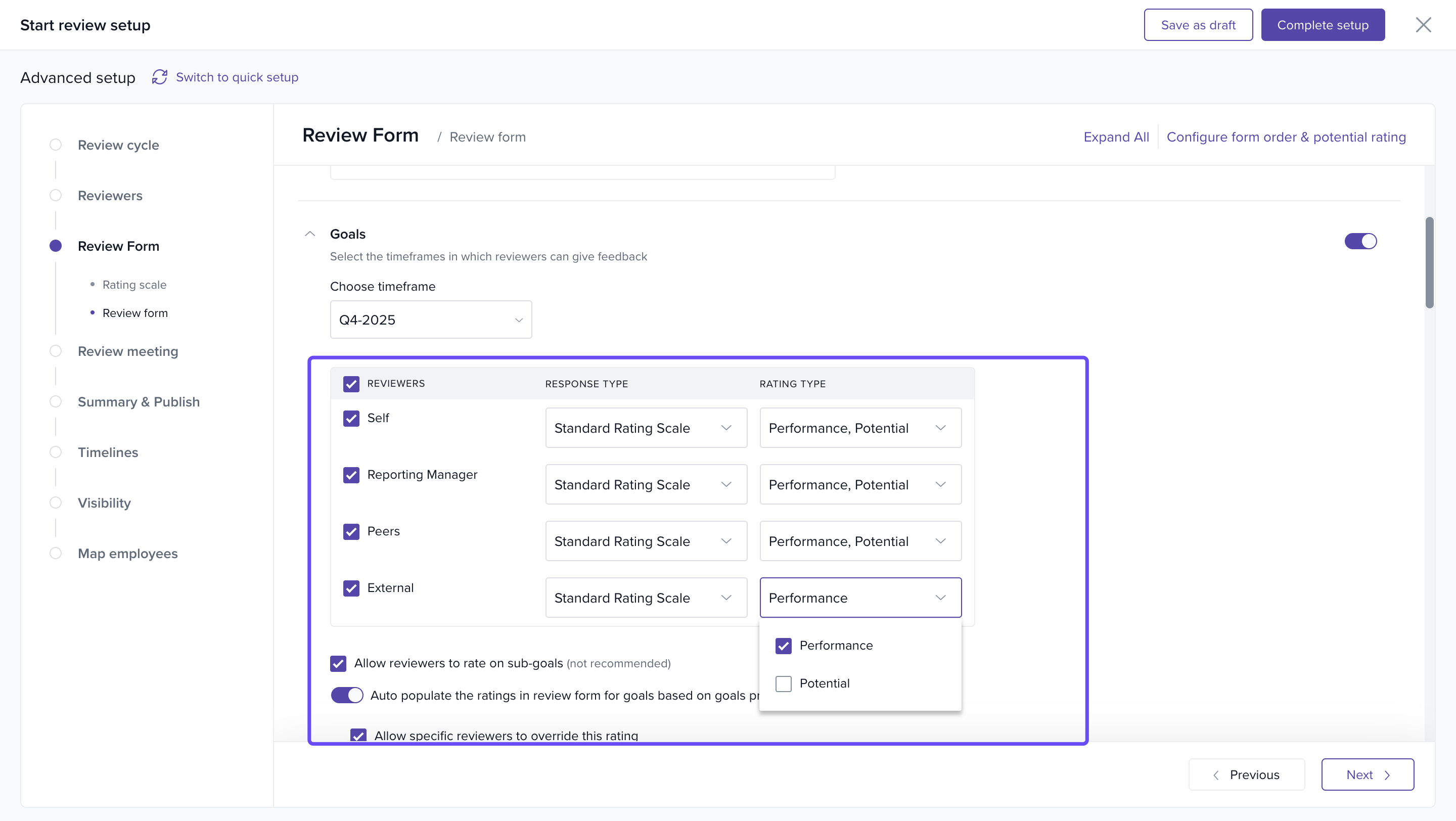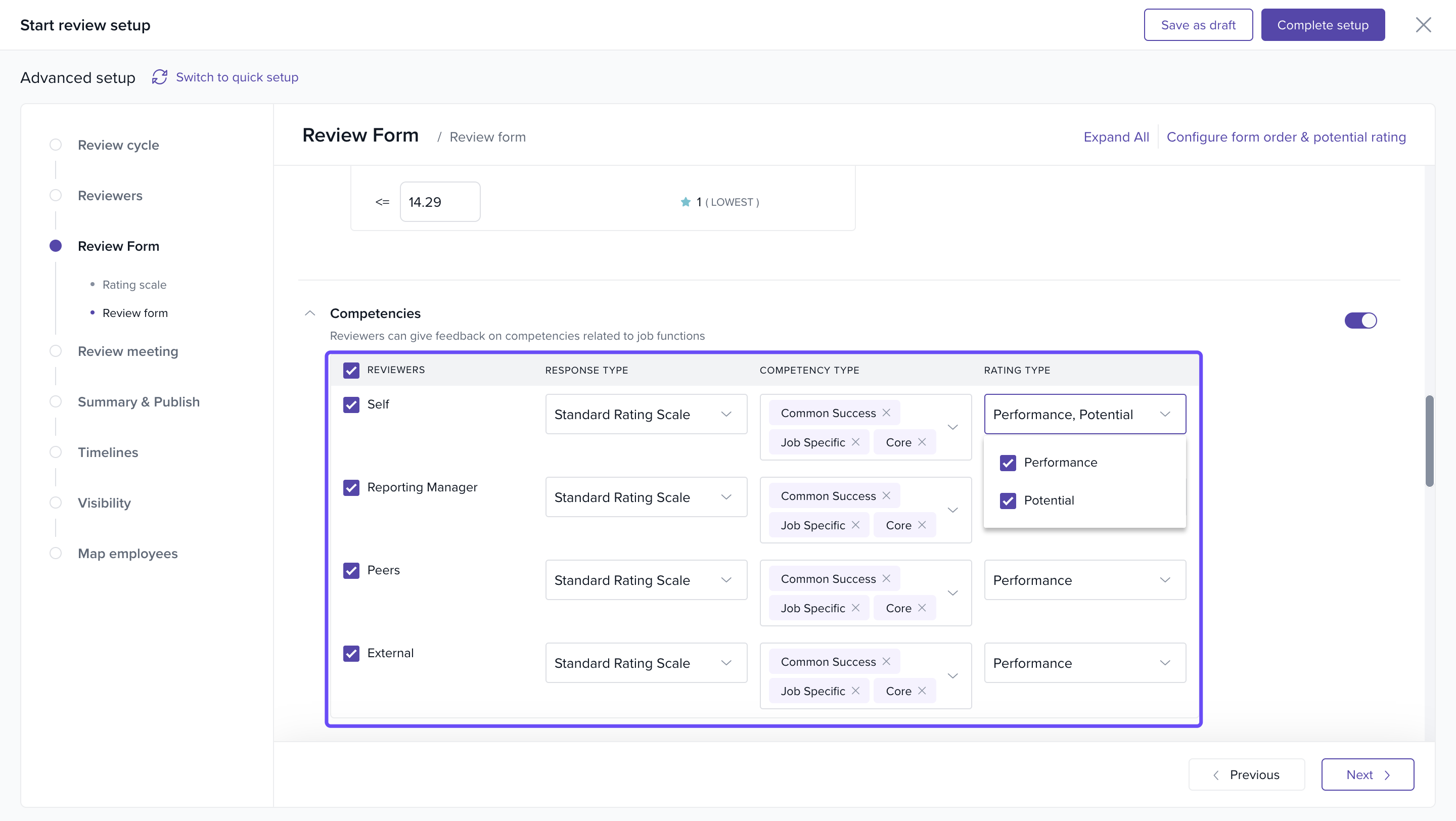 - For the Competencies part, you get to choose who will assess them and what types of feedback they can offer. You can also select specific competencies for each reviewer to concentrate on.