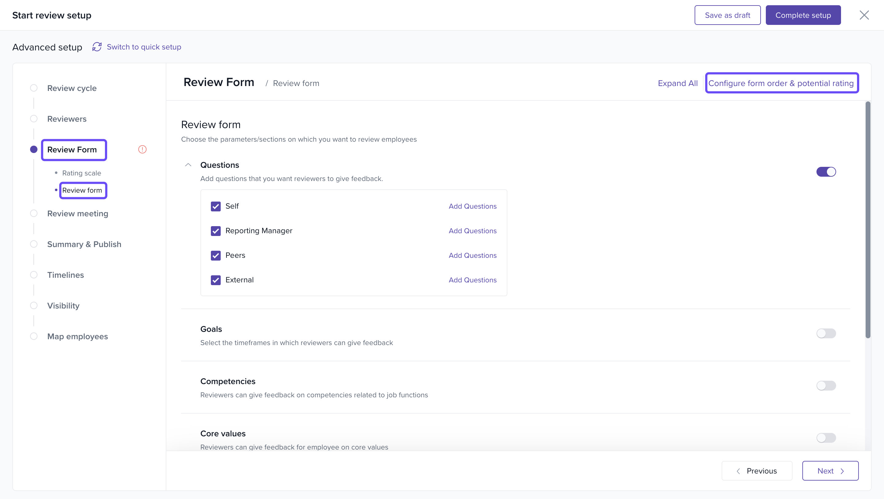 You can enable reviewers to evaluate an employee's performance in key areas of the organisation, such as Questions, Goals, Core Values, Projects, Competencies & Skills. Moreover, you can configure the order in which these review aspects will appear on the reviewer's form.