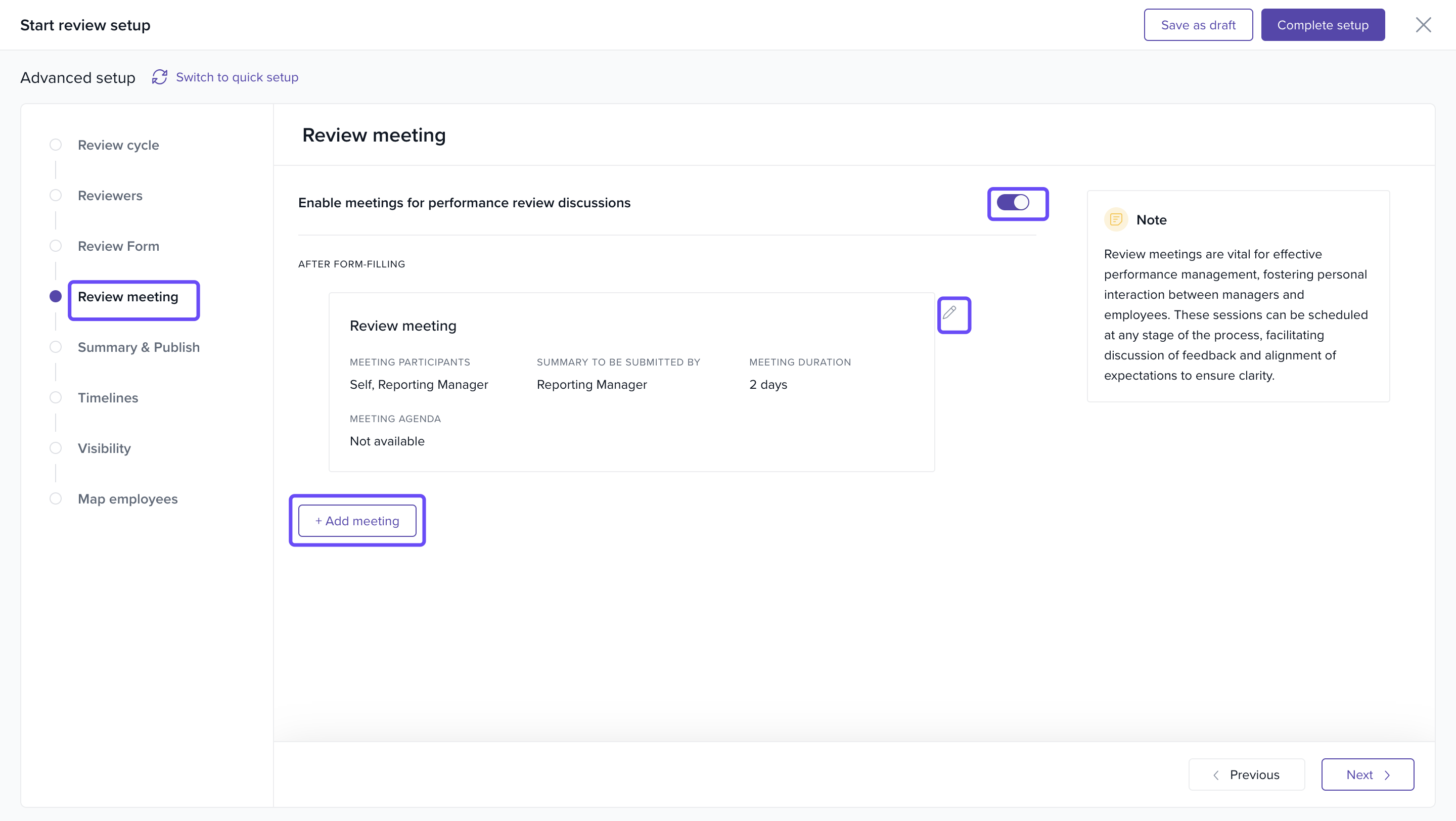Enable the "Enable meeting for performance review discussions" option and then click on +Add Meeting.