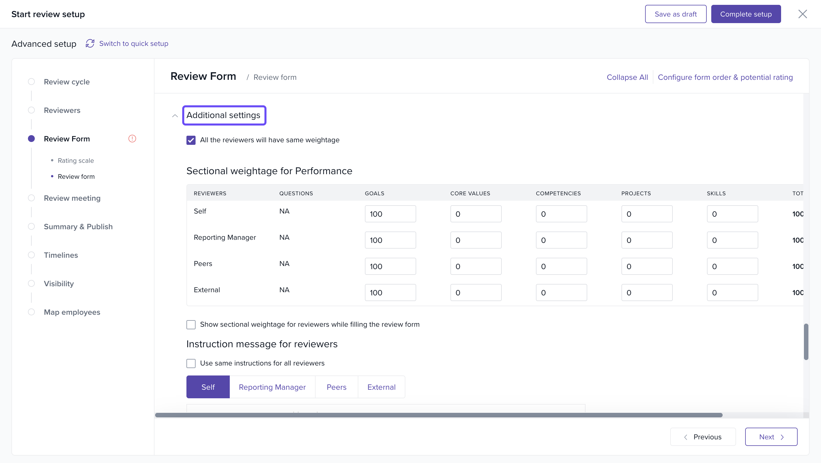 When you access Additional Settings, you will find options to allocate different weights for each reviewer and for each parameter if you have enabled ratings.
