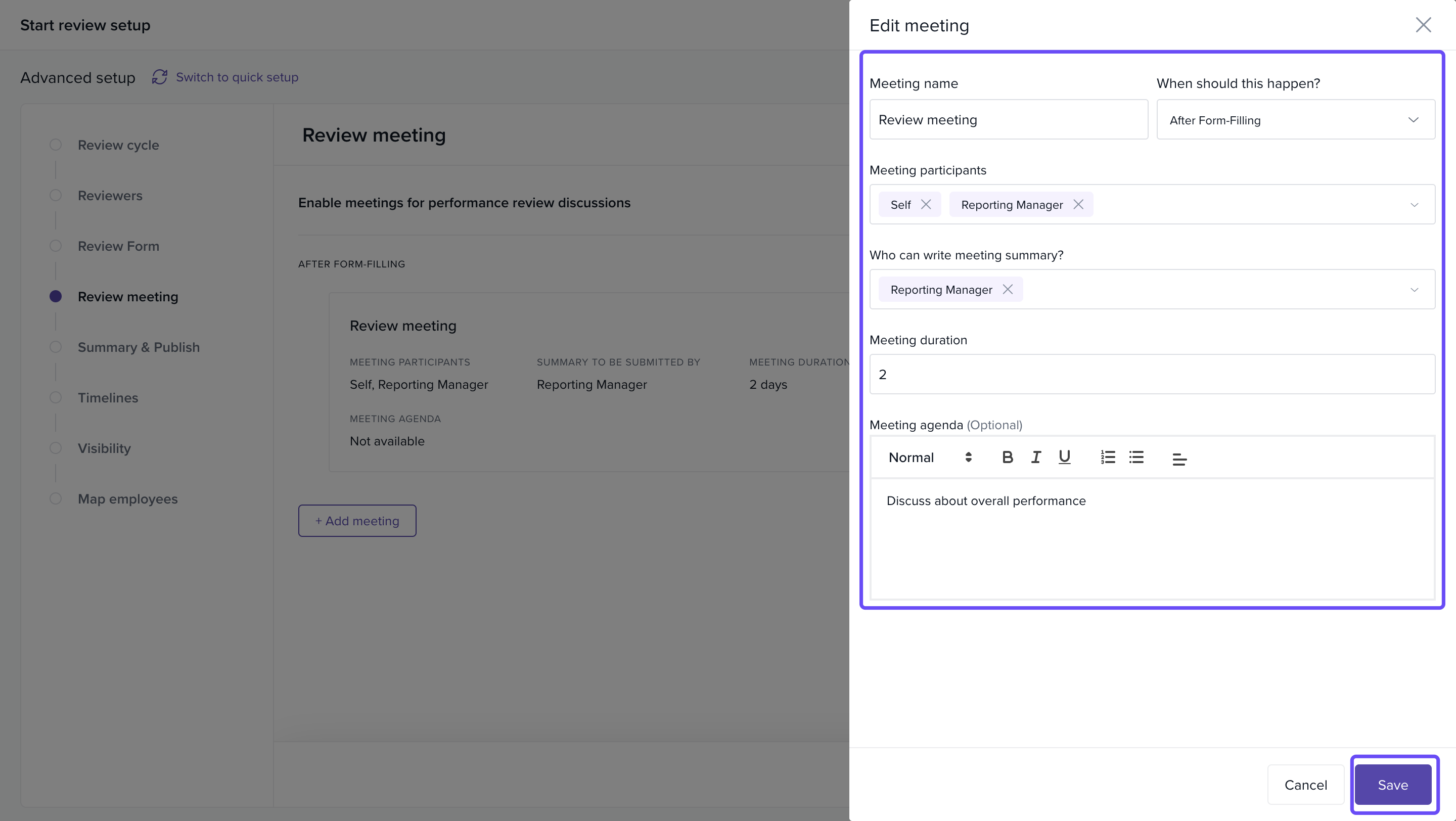 And there you go! That's how you set up a review cycle using Advanced options. Remember, you can always save your settings and come back later if you need to make adjustments.