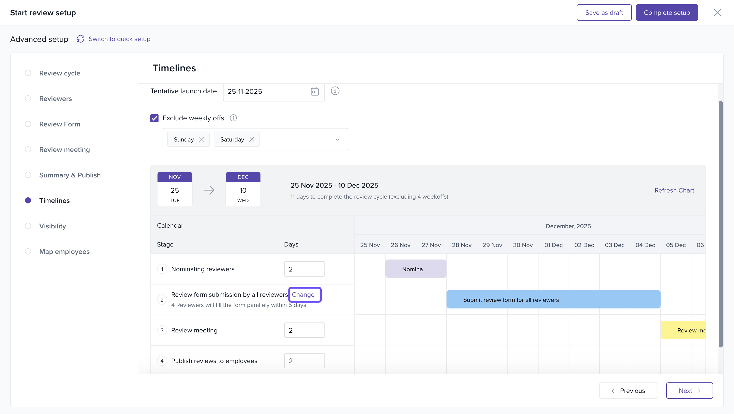 Set deadlines for each stage of the review process, such as nominating reviewers, submitting forms, and publishing reviews. You can also exclude weekends from the timelines.