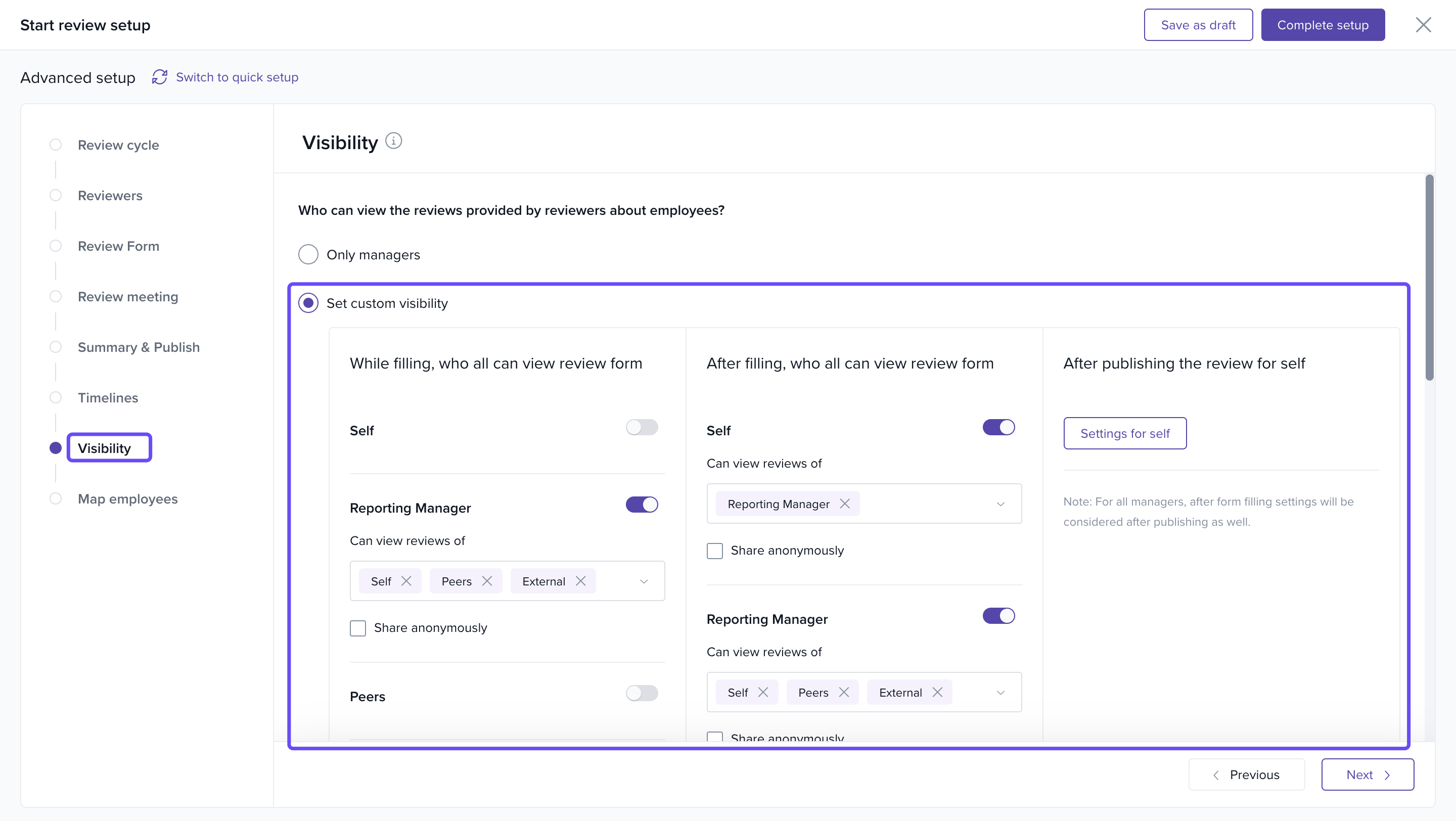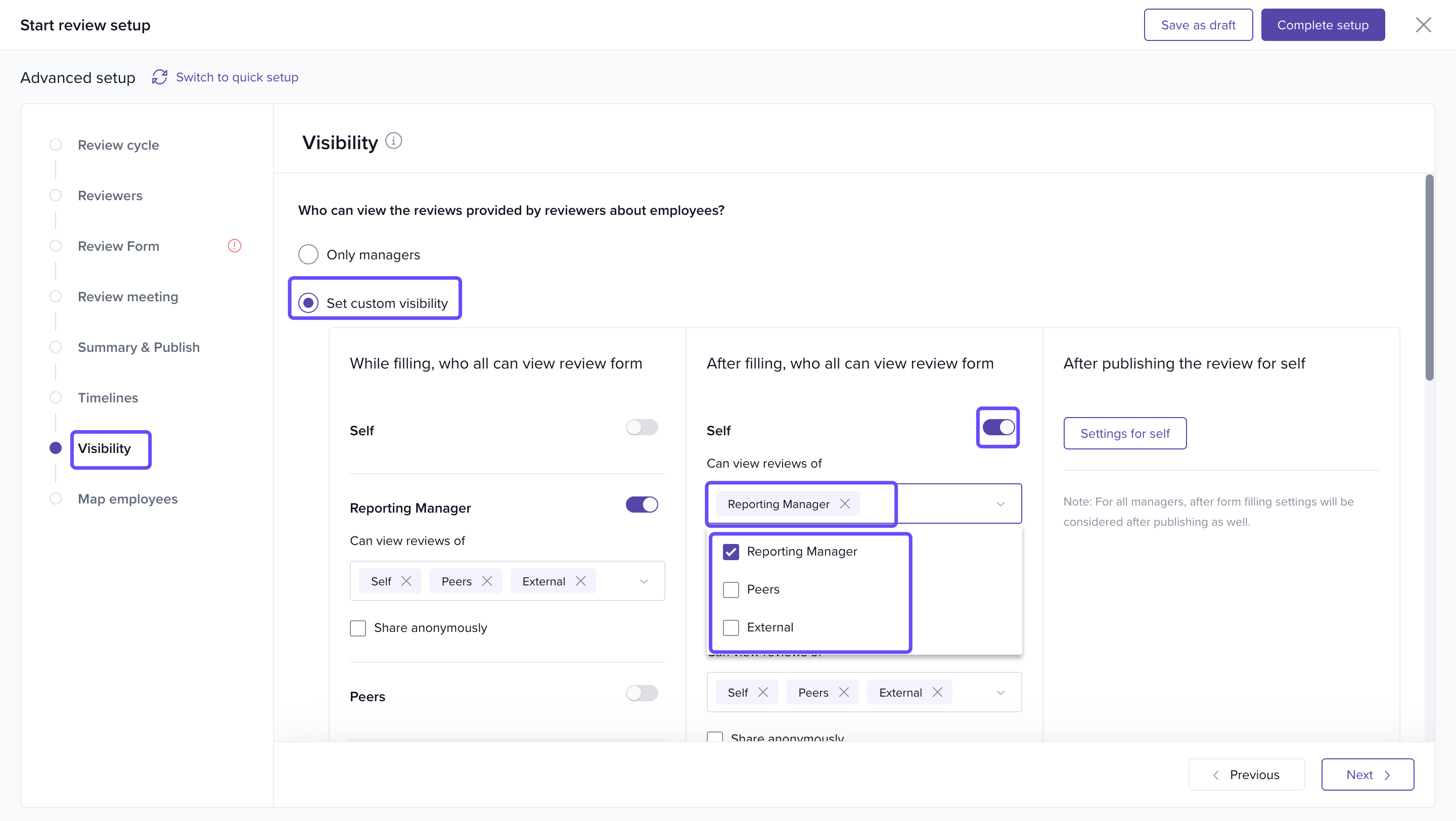 Navigate to the Visibility Settings and select Set Custom Visibility to define the level of access for each reviewer.