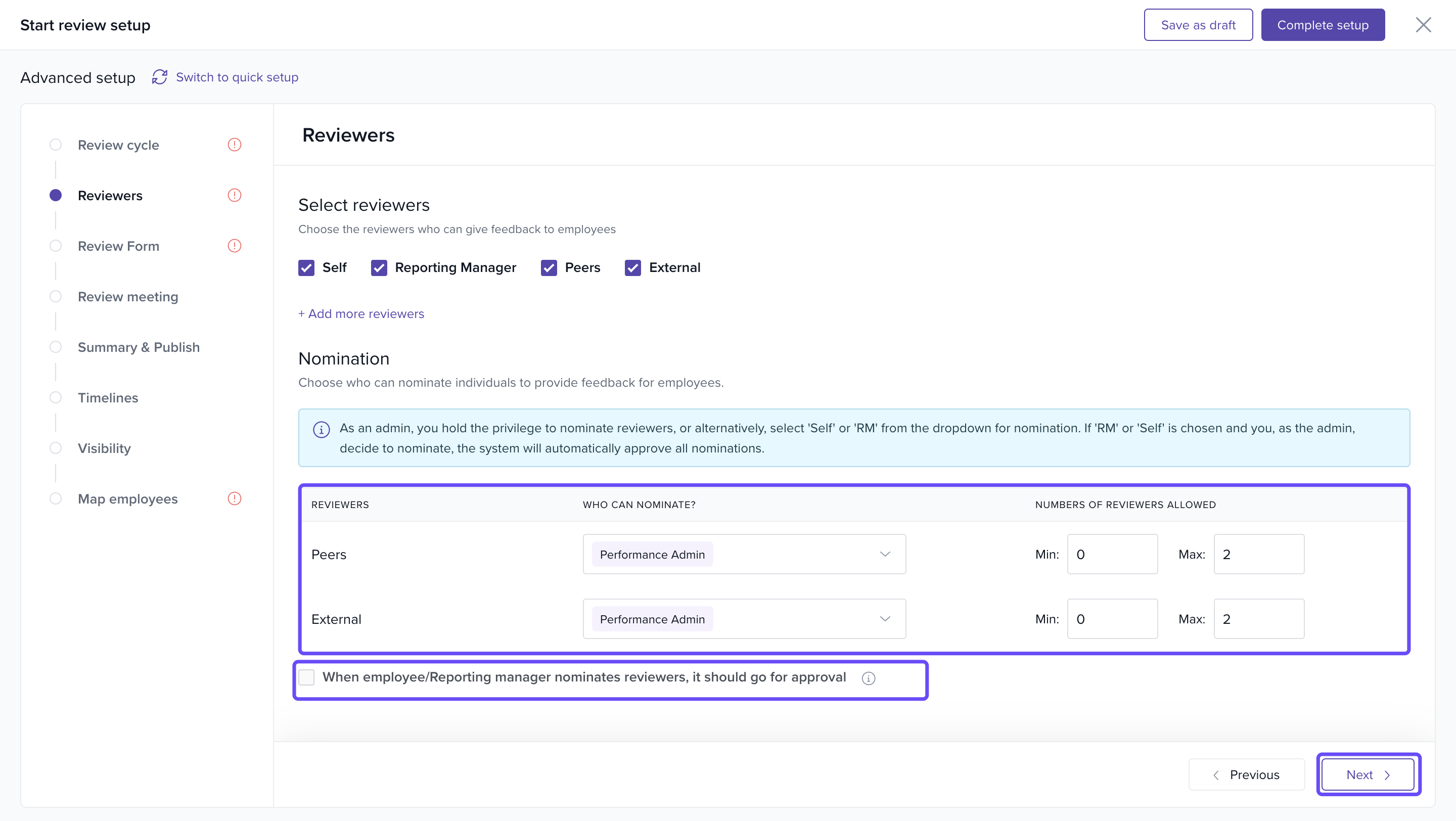 You can customise who nominates reviewers, the minimum and maximum number of reviewers, and enable notifications for approvals whenever a self or reporting manager nominates a reviewer.