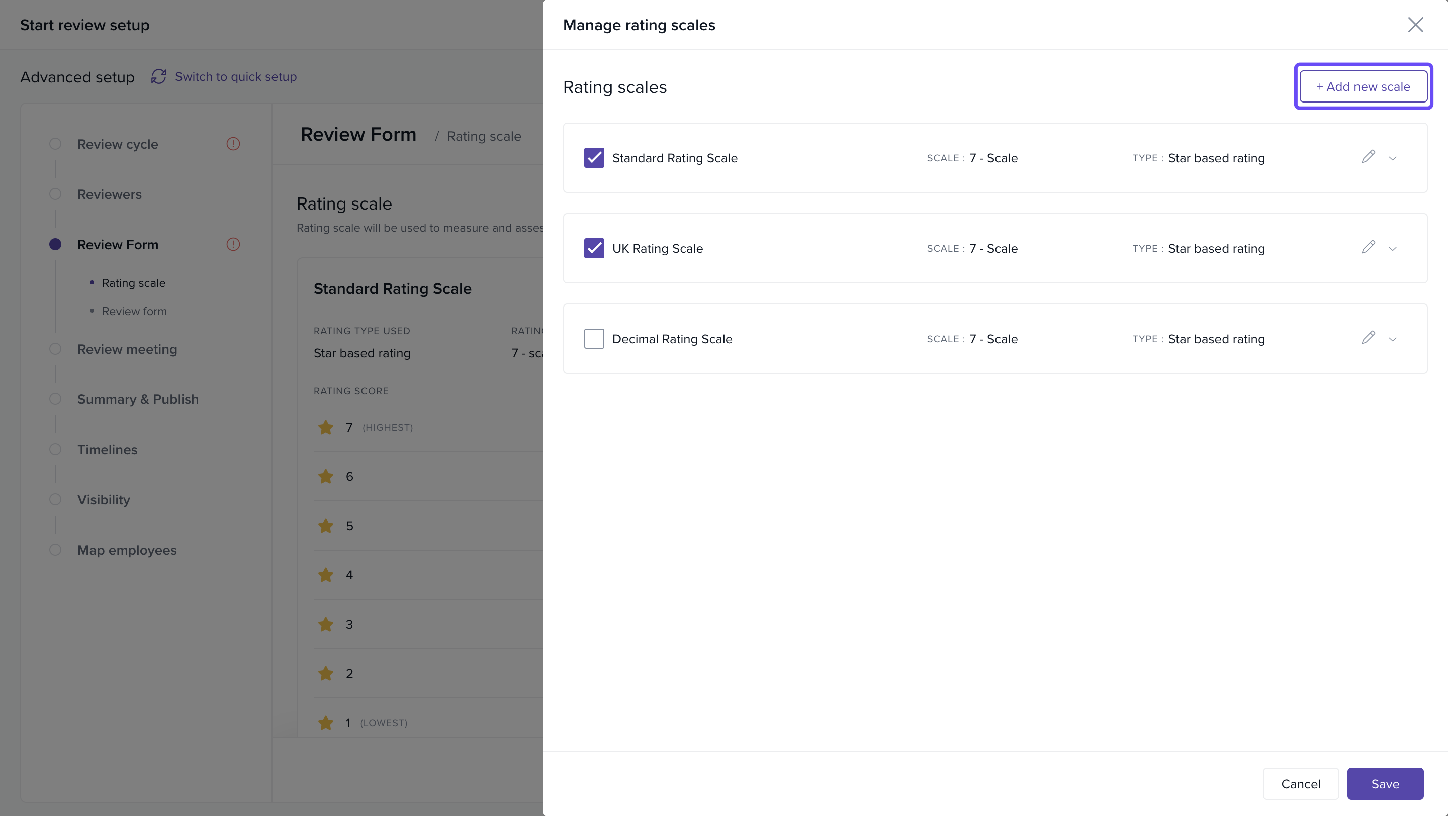 Navigate to the Review Form section. Click on Rating Scale to view the current scale.