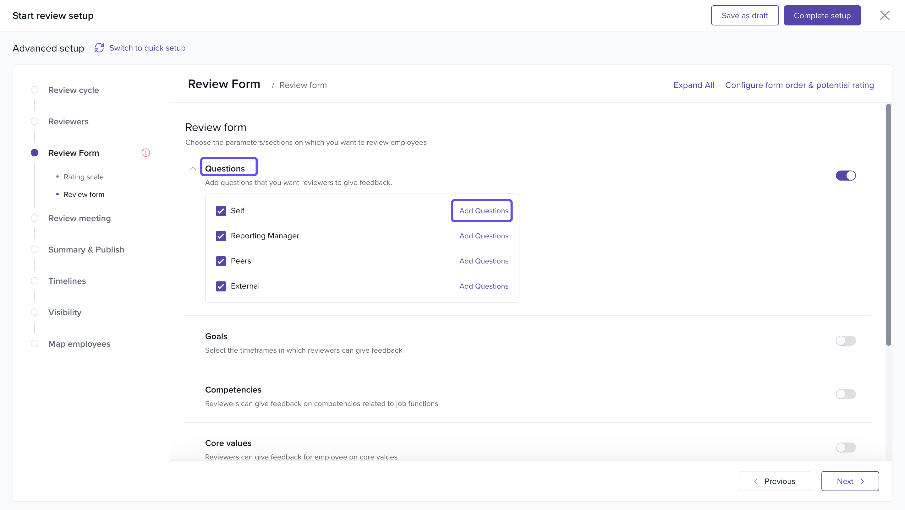 Once the rating type is decided, configure the review form by selecting which reviewers are required to fill out the form in the Question section. You can add custom questions or choose from pre-existing templates.