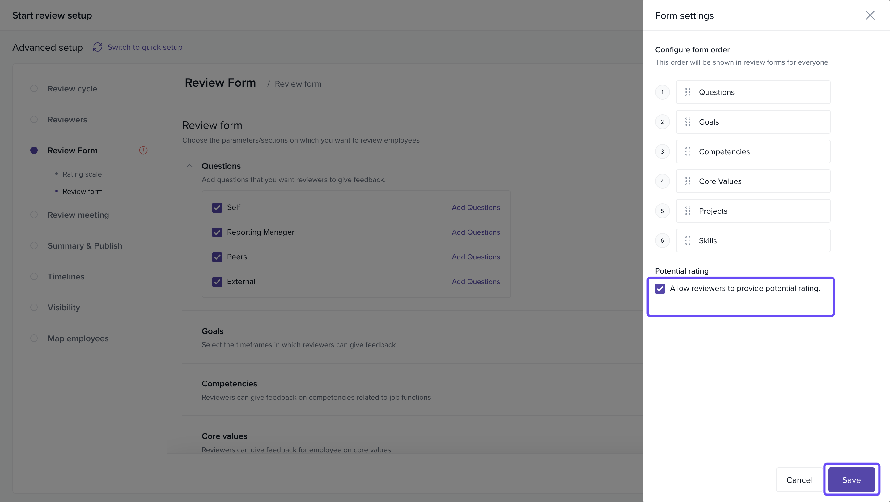 To enable potential ratings, simply toggle the Allow reviewers to provide potential ratings option in the settings and click on Save.