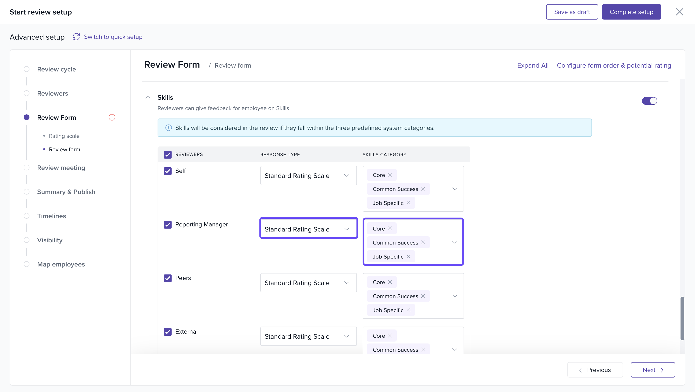 For Skills you choose the reviewers and define the response types and also you can choose which category each reviewer should focus on.