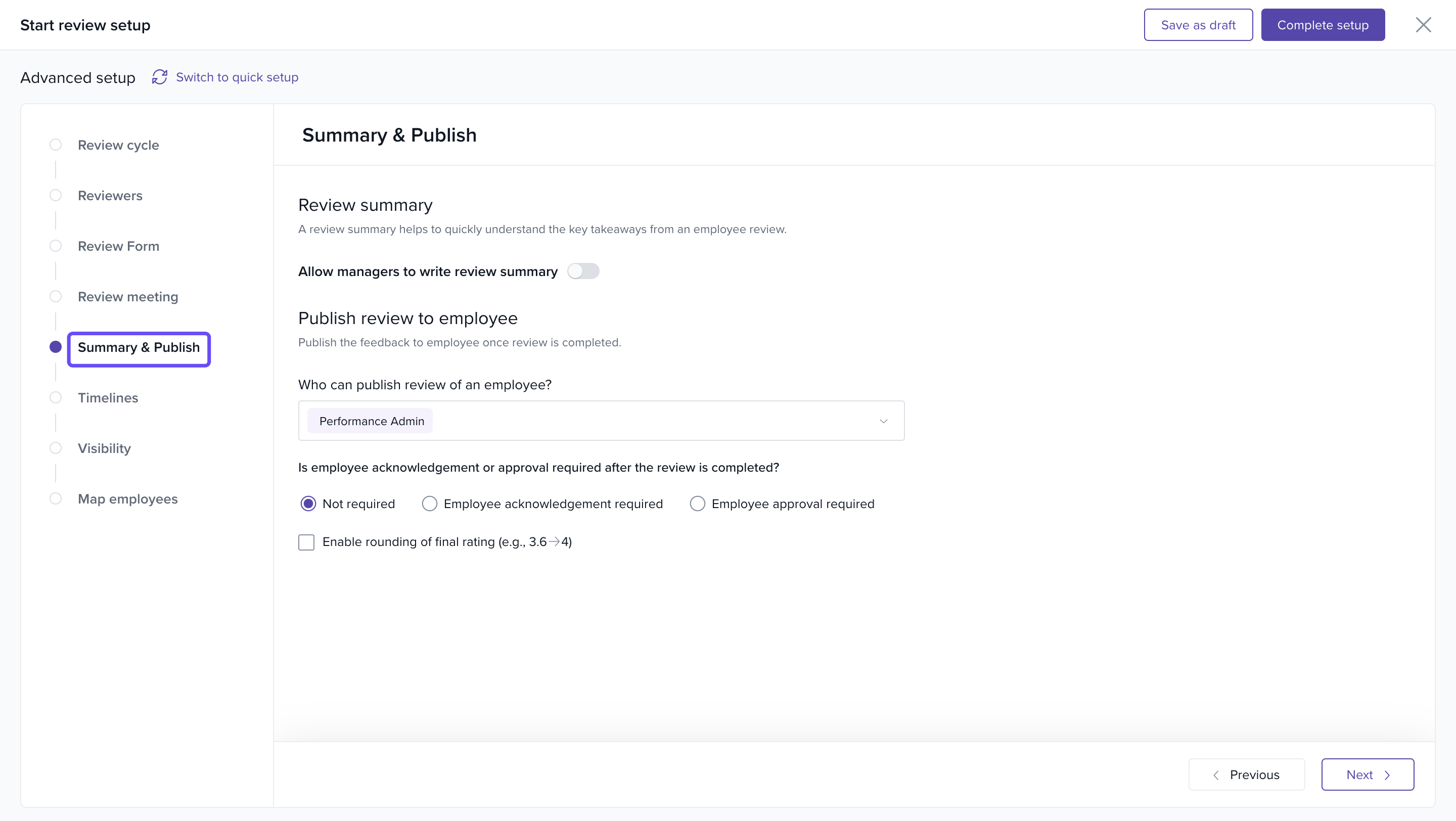 In this step, decide who will write the review summary and who will publish the feedback. You can also make it mandatory for the employee to acknowledge the feedback.
