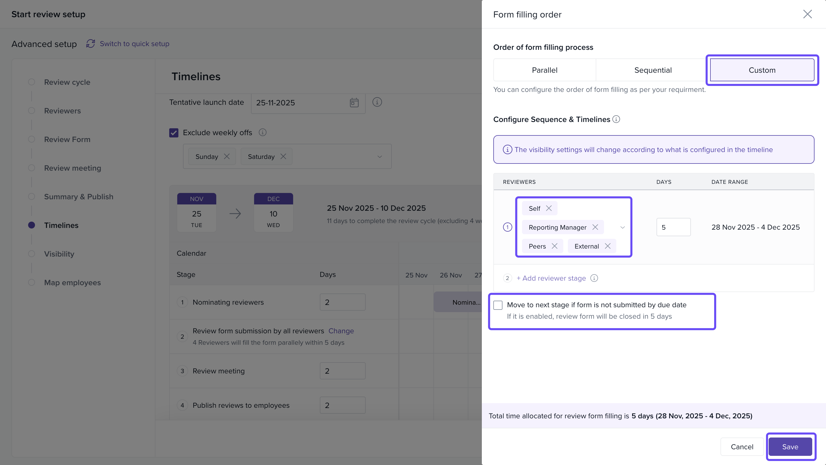 Within the 'Form filling order' window, select the Custom option to begin configuring individual timelines. In the Configure Sequence & Timelines section, you can add various reviewer stages, such as Self, Reporting Manager, or Department Head. Specify the number of days allocated for each reviewer by inputting the desired time frame next to each reviewer type.