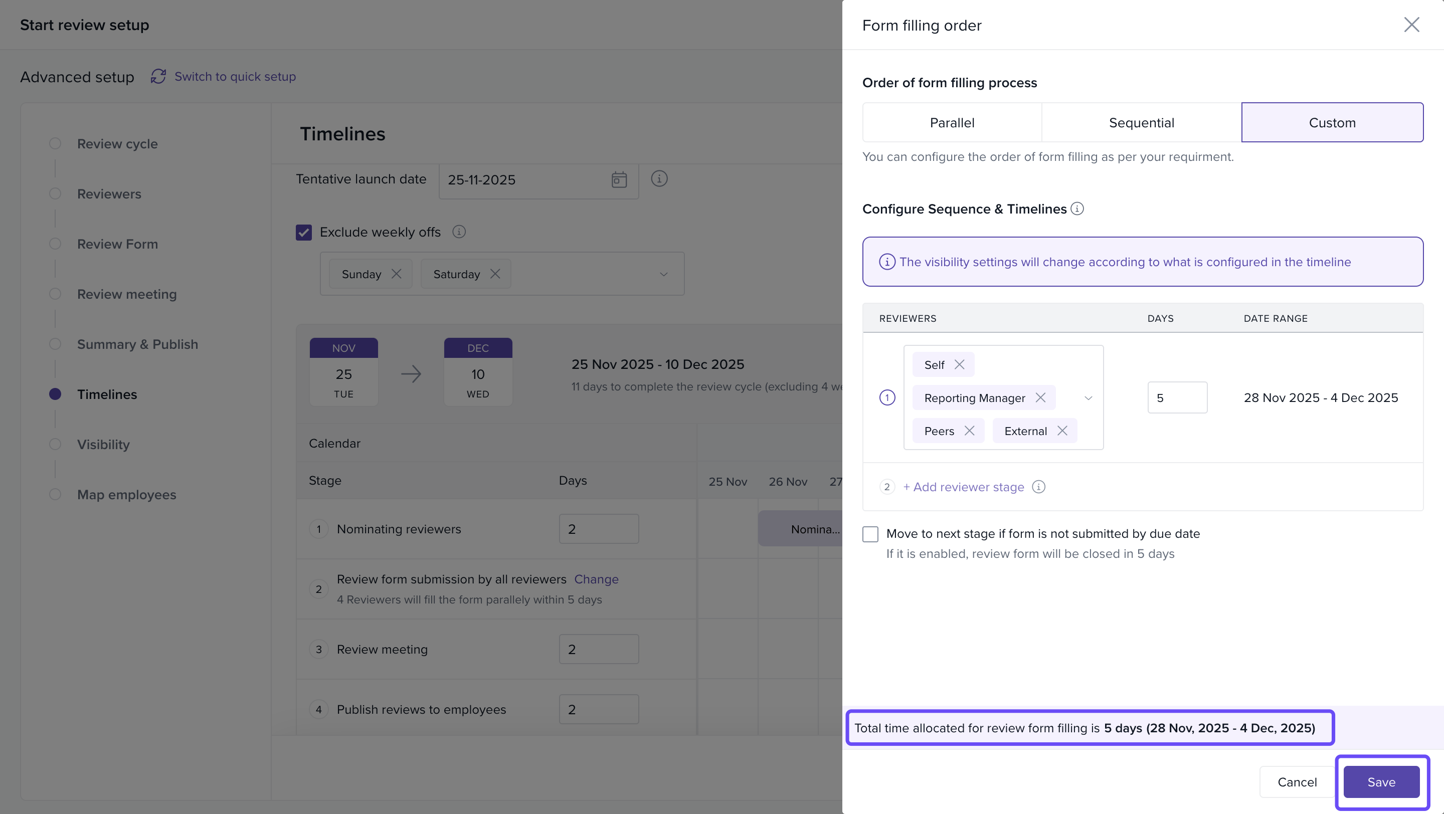 Review your custom timeline settings and total days to ensure they align with your review cycle goals. Click Save to implement the custom timelines for your review process.