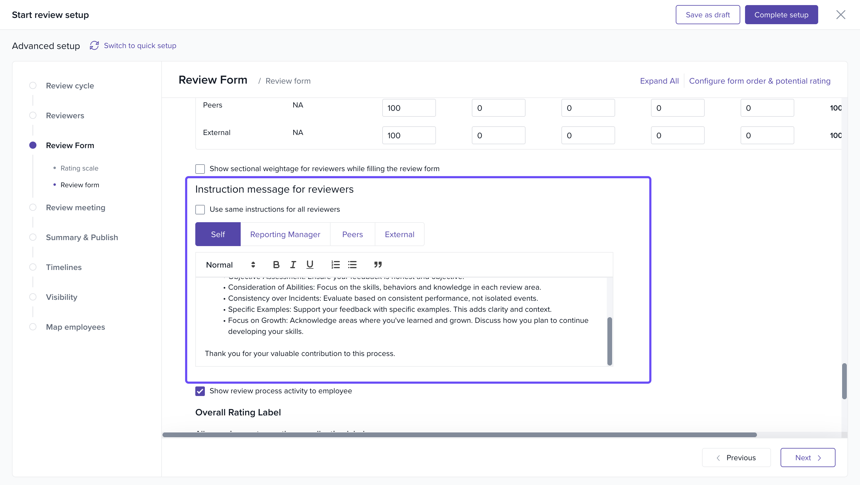 - Upon enabling the Overall Rating Label setting, a new visibility option is made available for the review forms, To access this, navigate to Visibility Settings of the review section. In this section, you will need to select "Set Custom Visibility" and enable the option for self-viewing, allowing you to access the review forms of other reviewers in the After filling stage. Additionally, you can choose a specific reviewer from the dropdown menu. You can also modify the settings for all other reviewers both during and after the completion of the form.