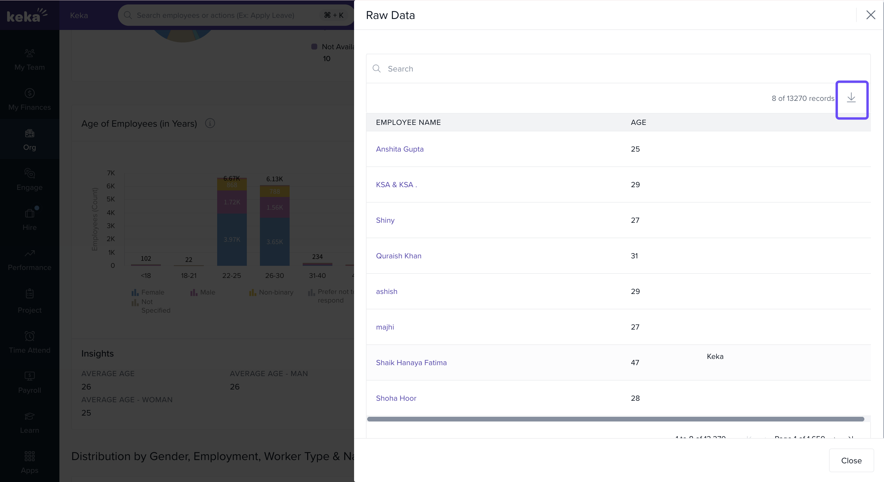 Use Keka’s Employee Analytics to get a clear view of your workforce demographics—such as age, gender, tenure, and employment type. These insights help you understand employee trends, support diversity, and refine internal policies.
