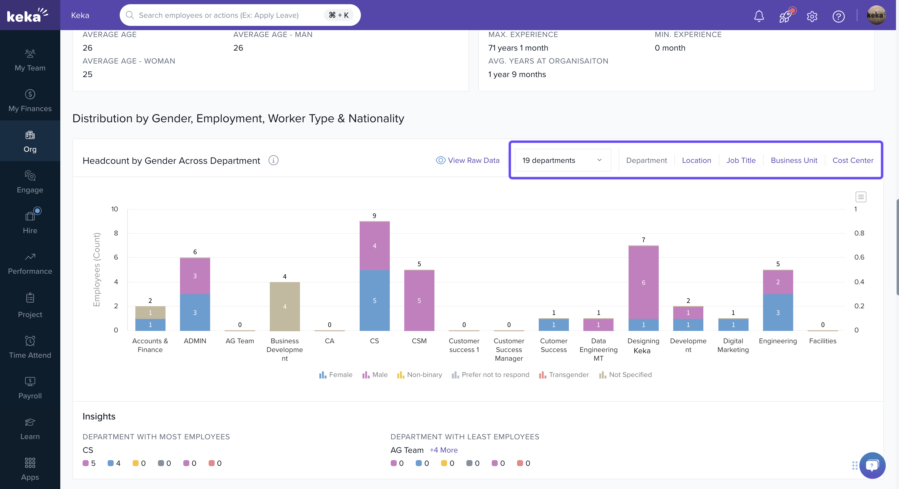 For example, to view gender distribution specifically for the Sales department, just select “Sales” from the Department drop-down.