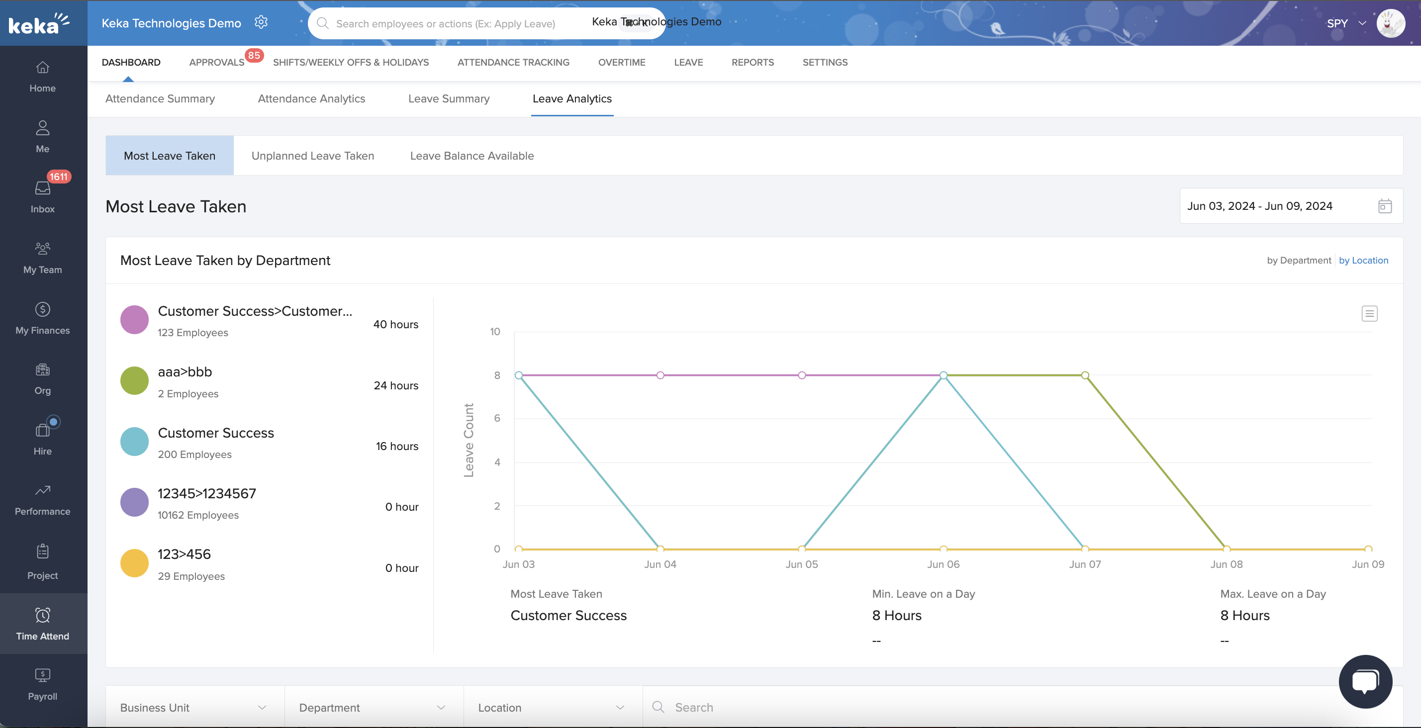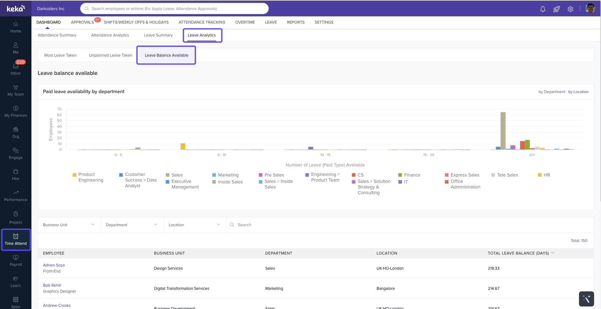 The Leave Analytics tab provides deeper insights into leave patterns: