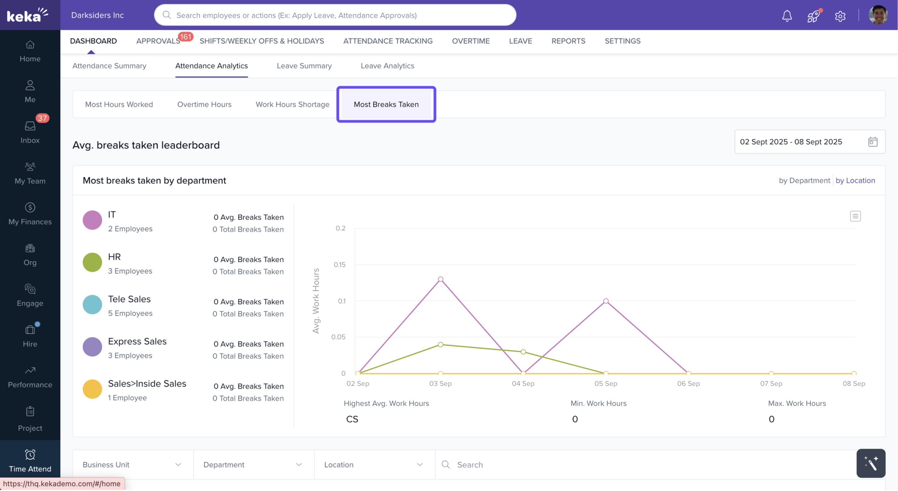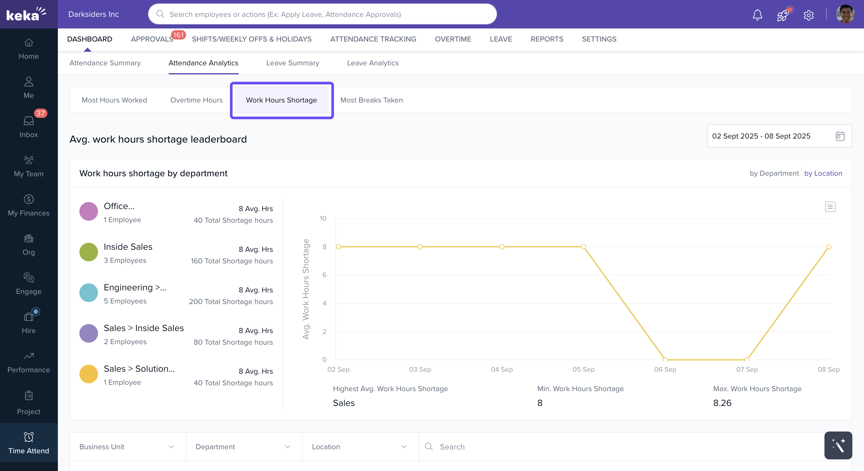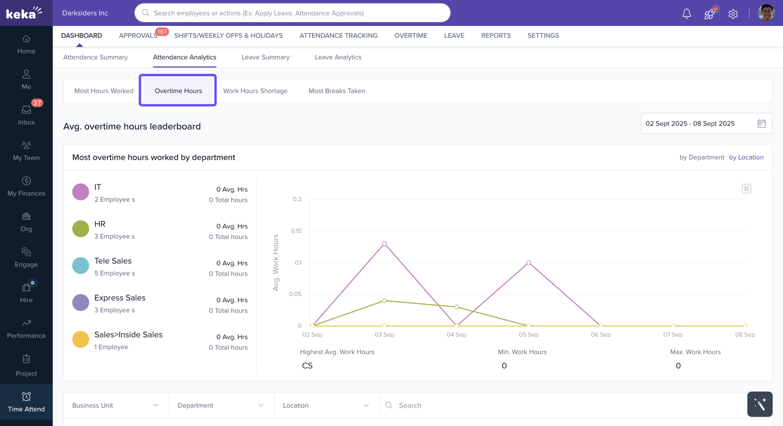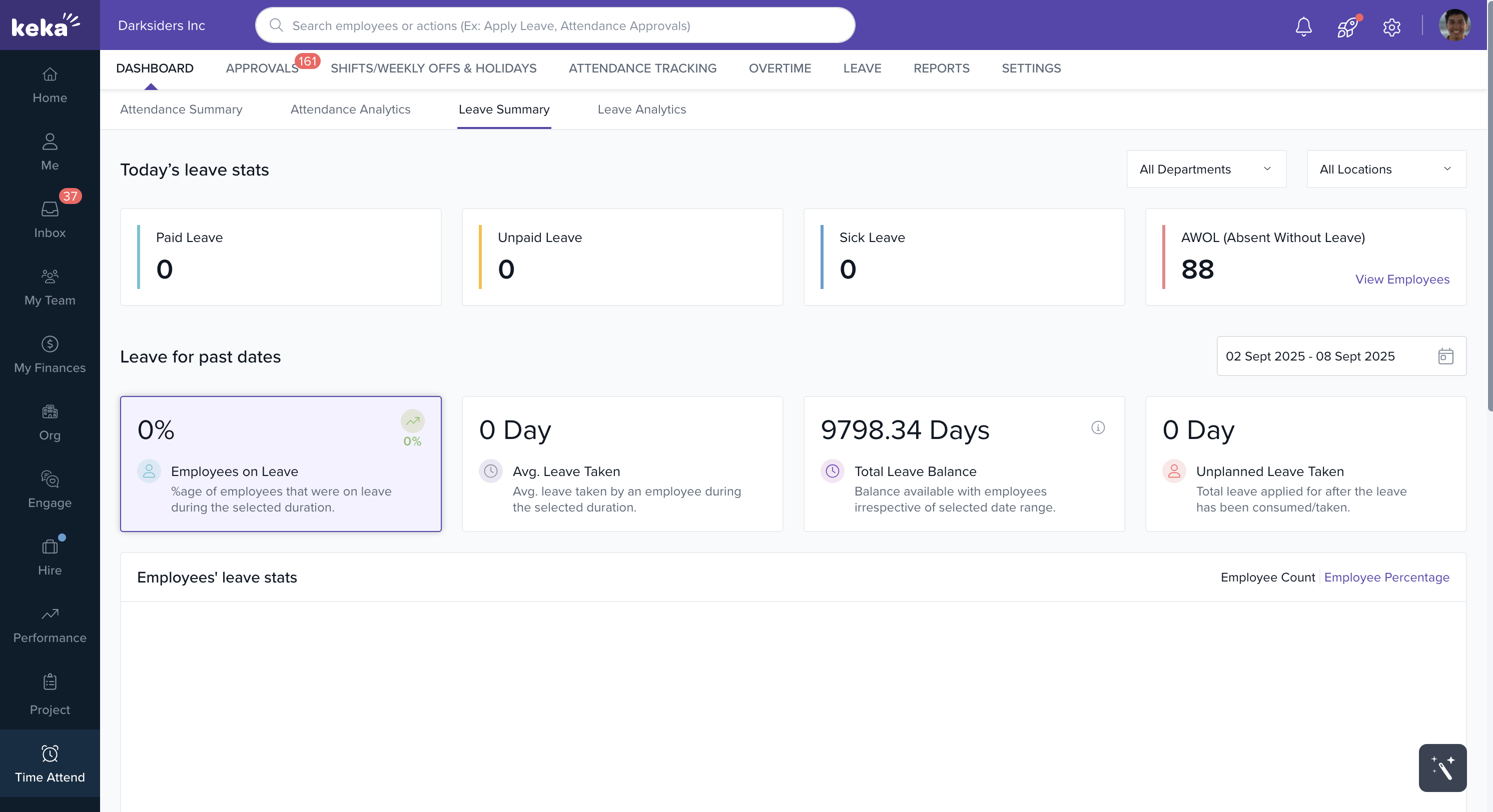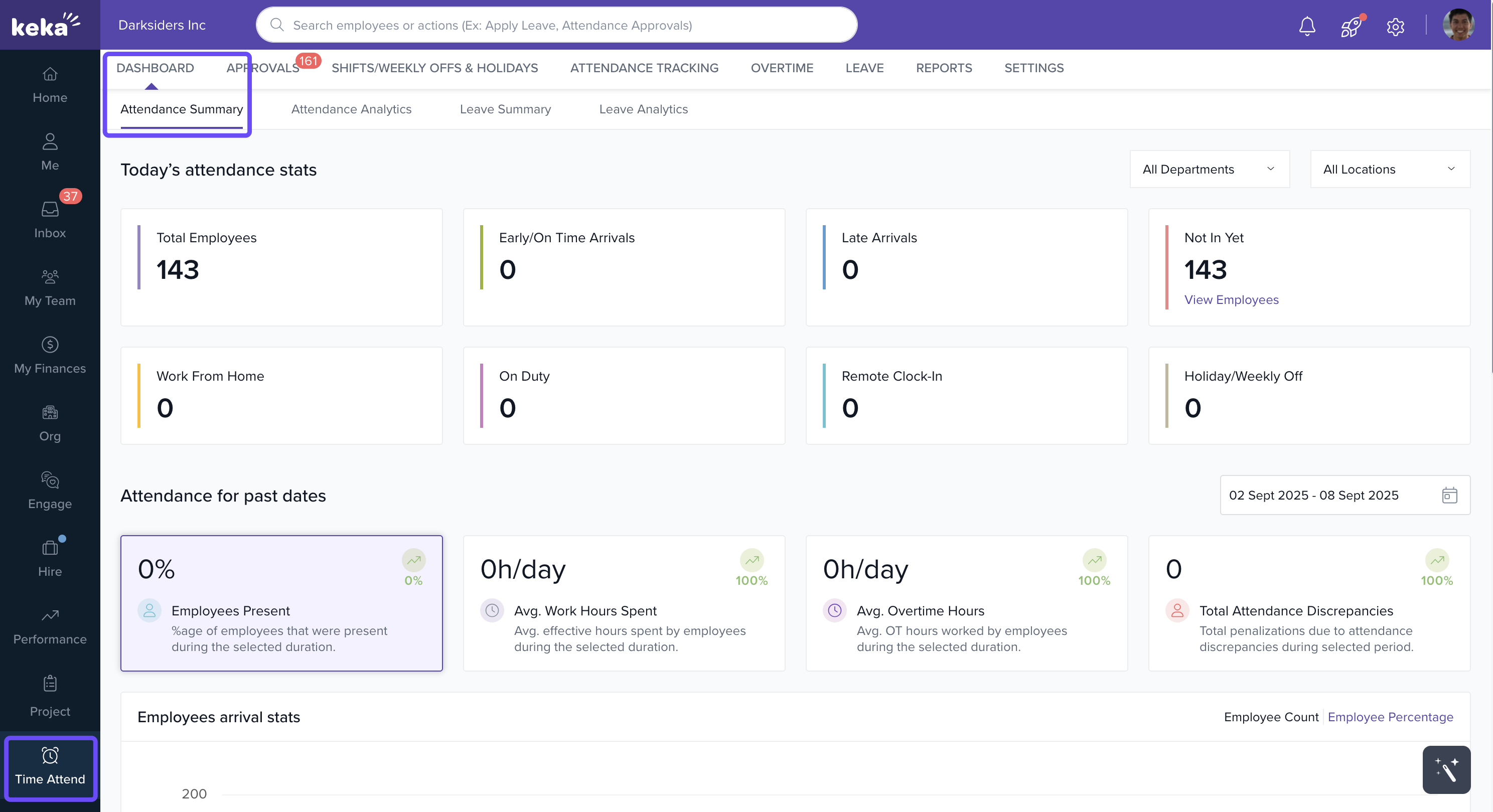 The Attendance Dashboard in Keka gives HR managers and administrators a complete view of attendance and leave trends across the organization. It is divided into four tabs: