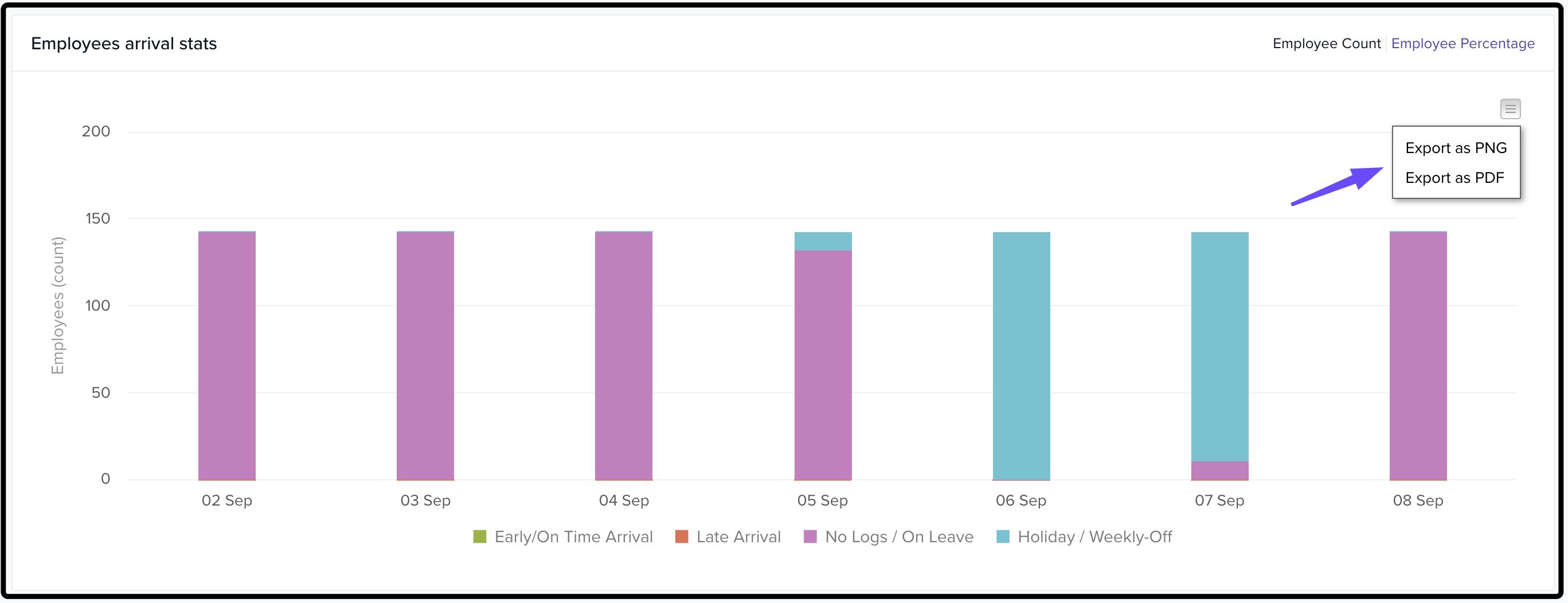 Graph of arrivals (early/on-time, late, no logs/on leave, holidays/off)