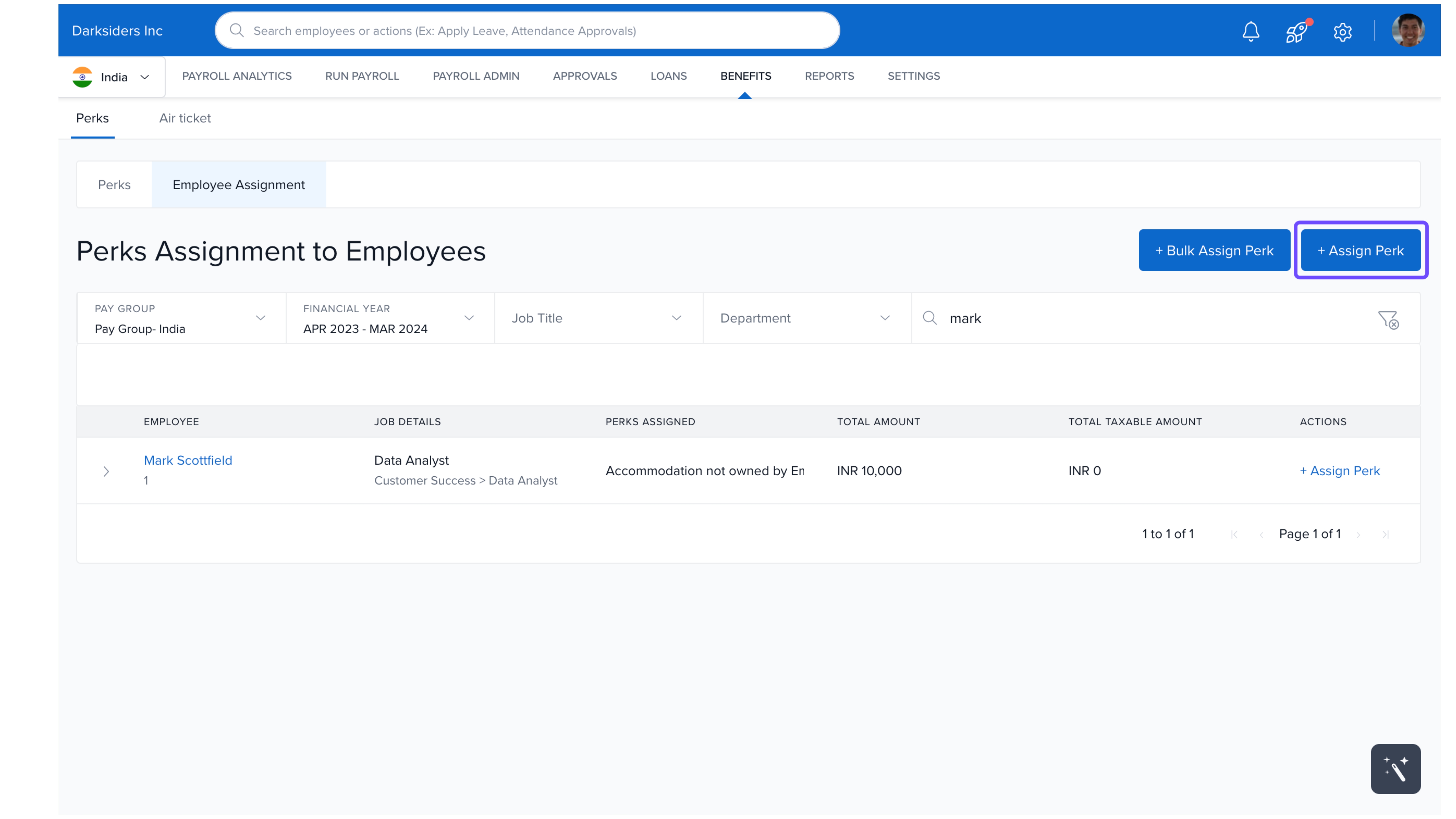 Go to Employee Assignment: Navigate to Payroll > Benefits > Perks, then open the Employee Assignment tab.