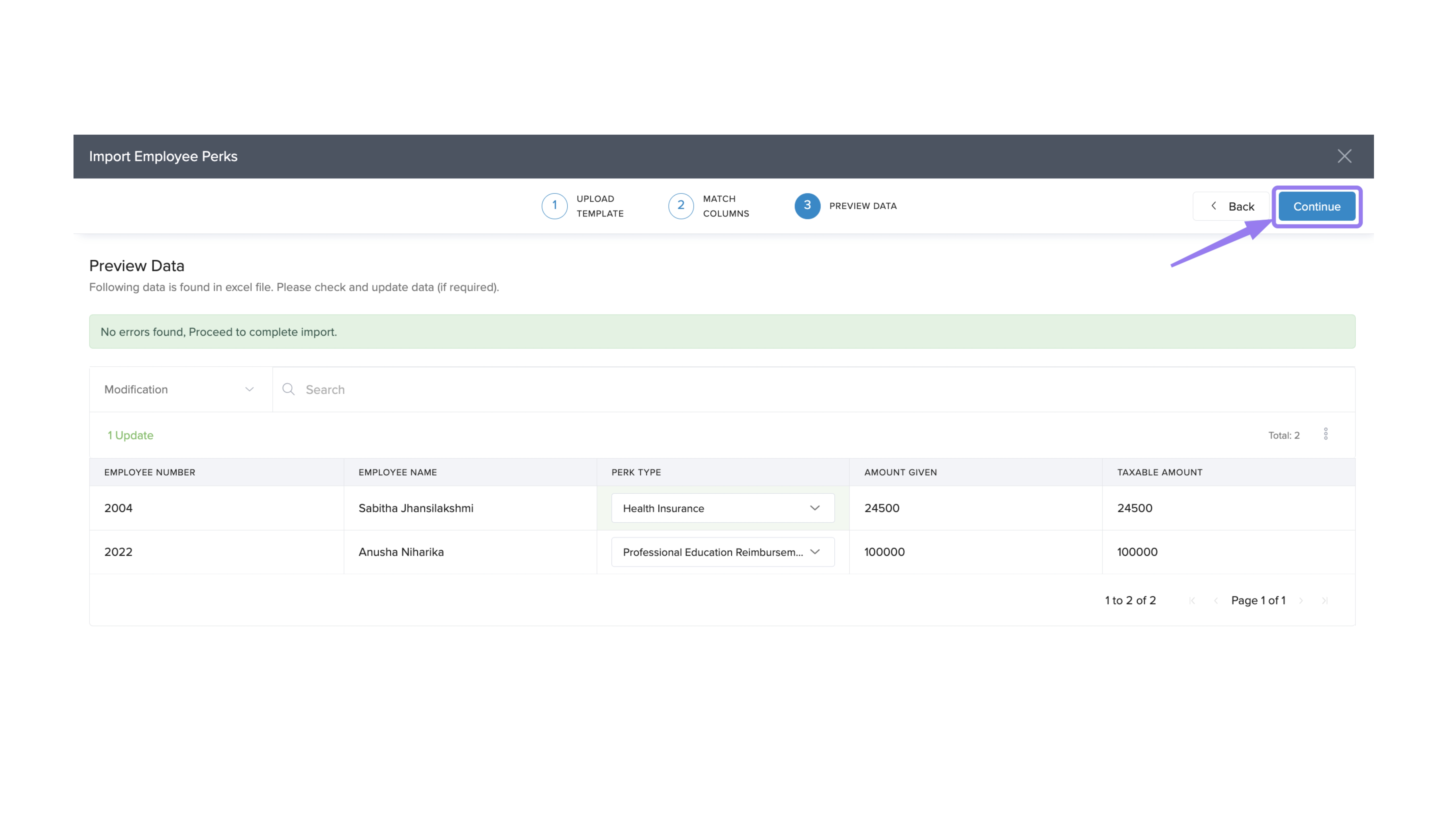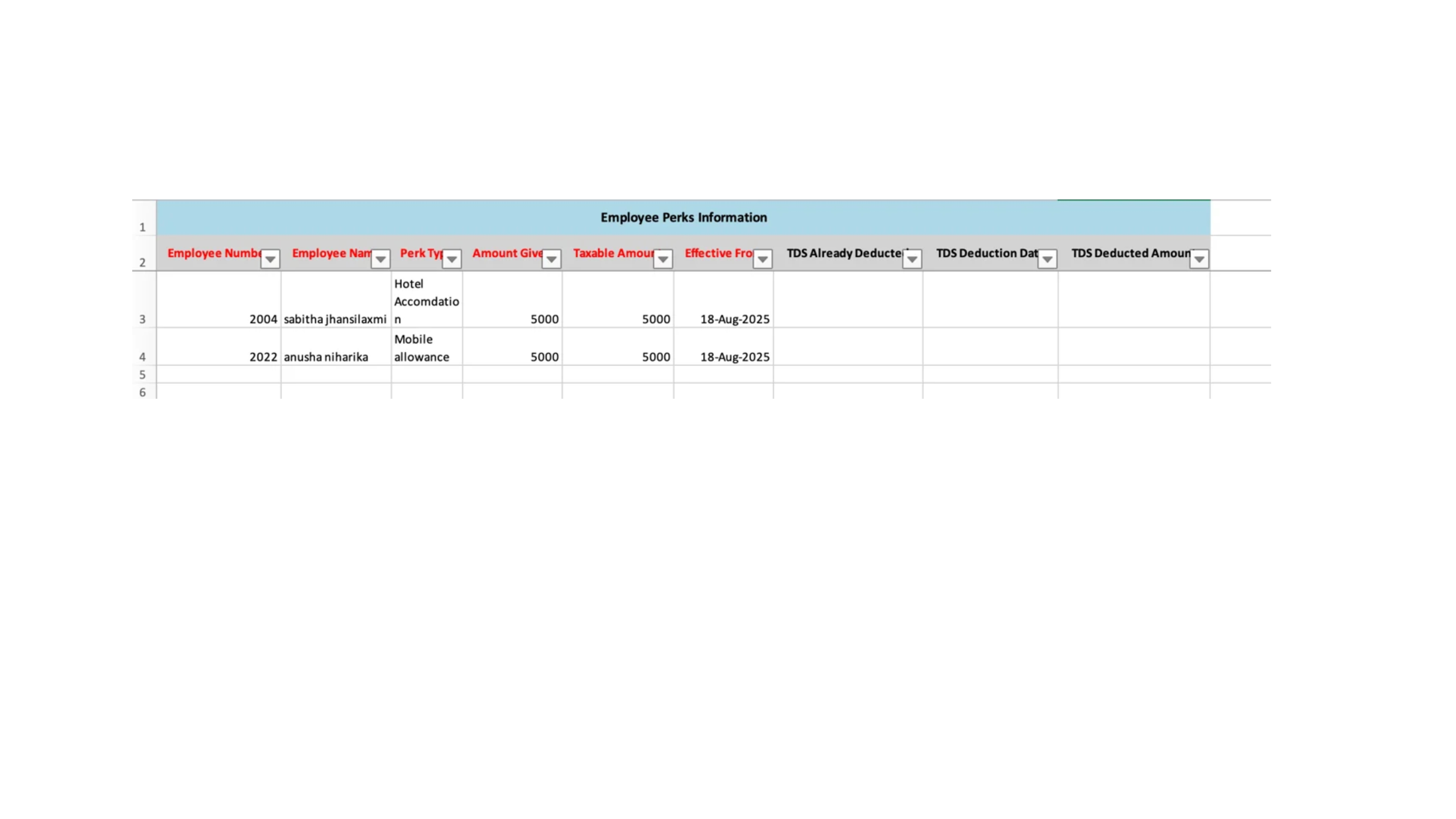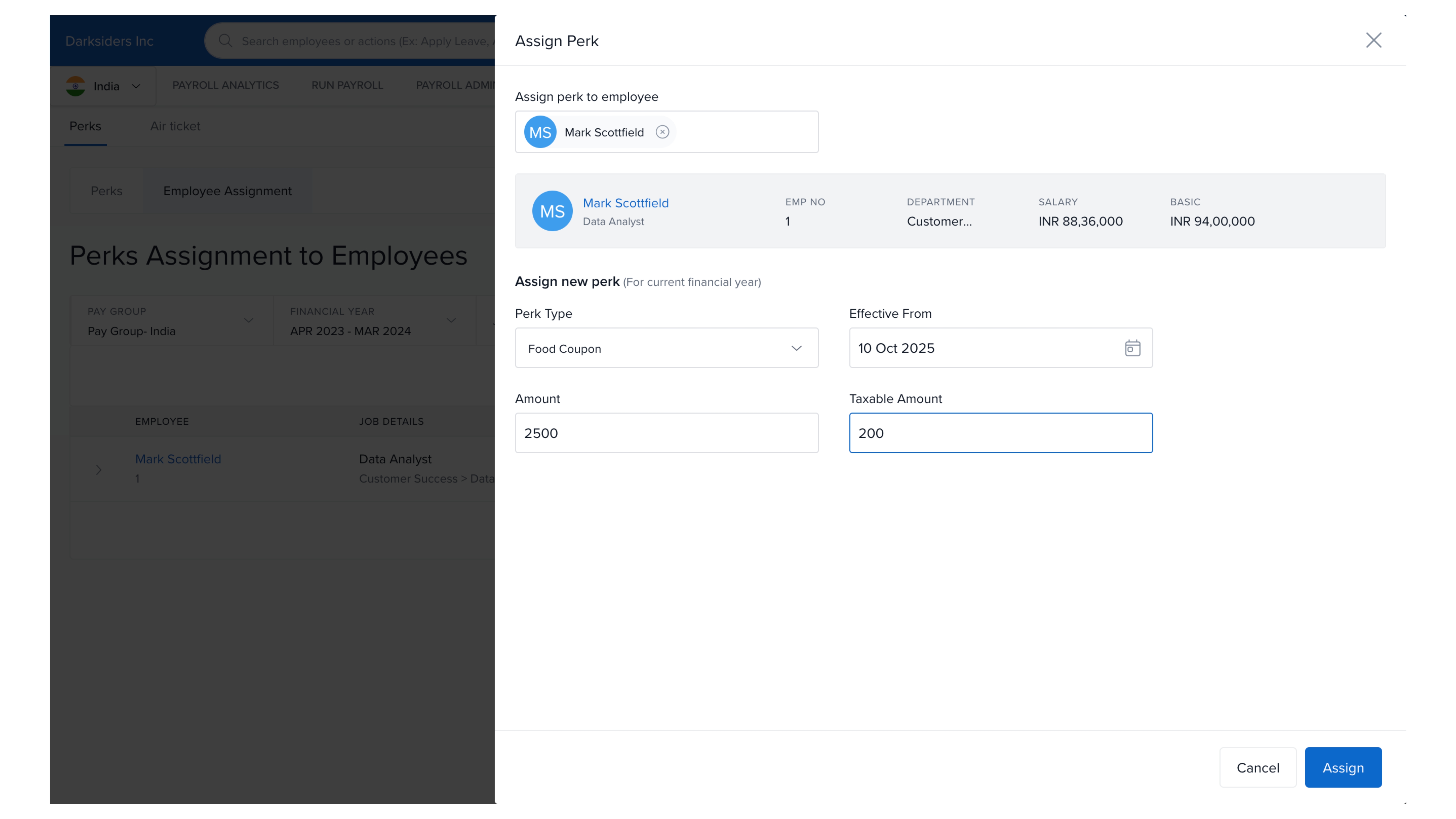 Enter perk details: If the perk is defined at the employee level, you can edit the Amount and Taxable Amount fields.