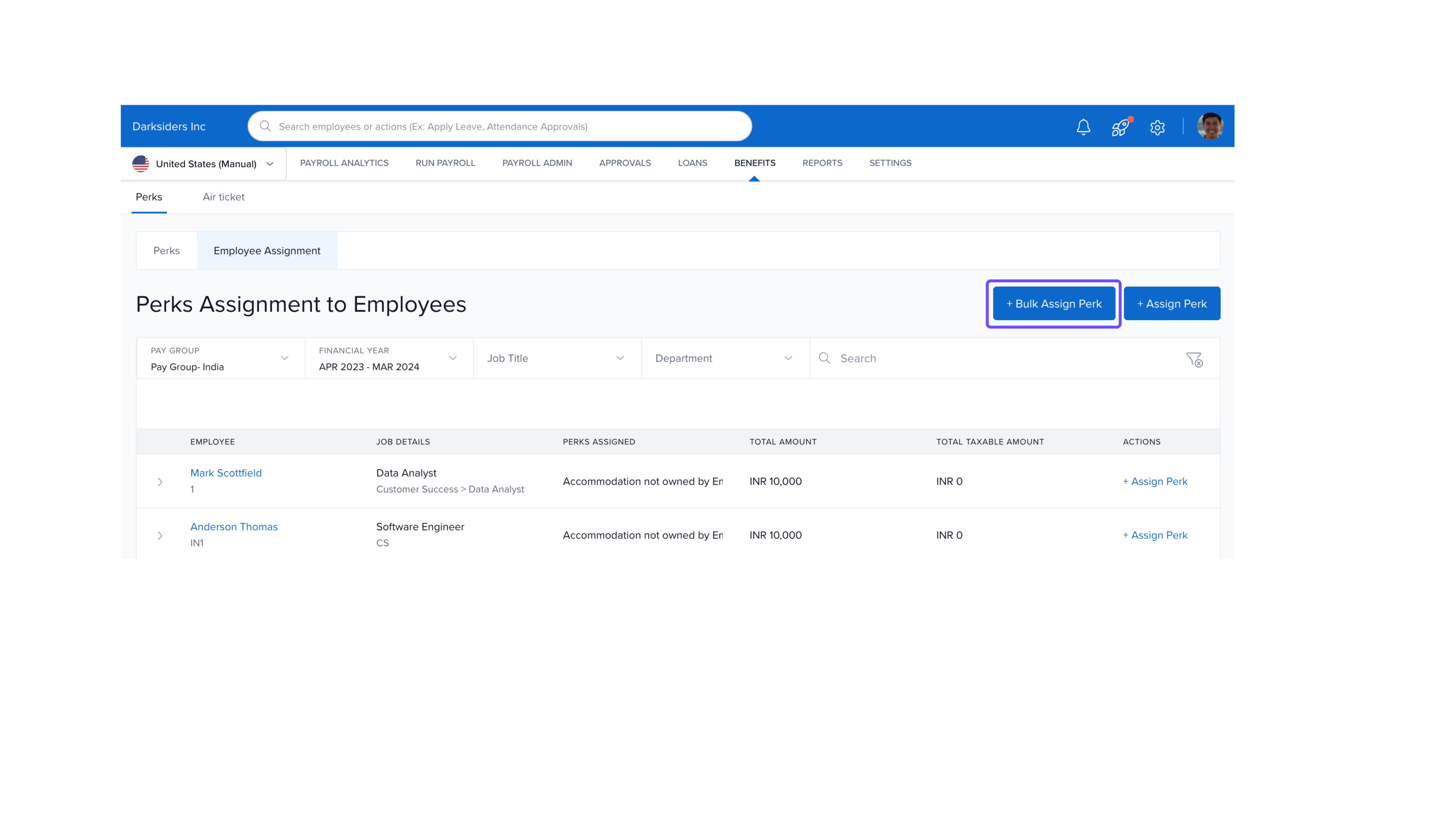 Go to Bulk Assign: In the Employee Assignment tab under Perks, click Bulk Assign Perk.
