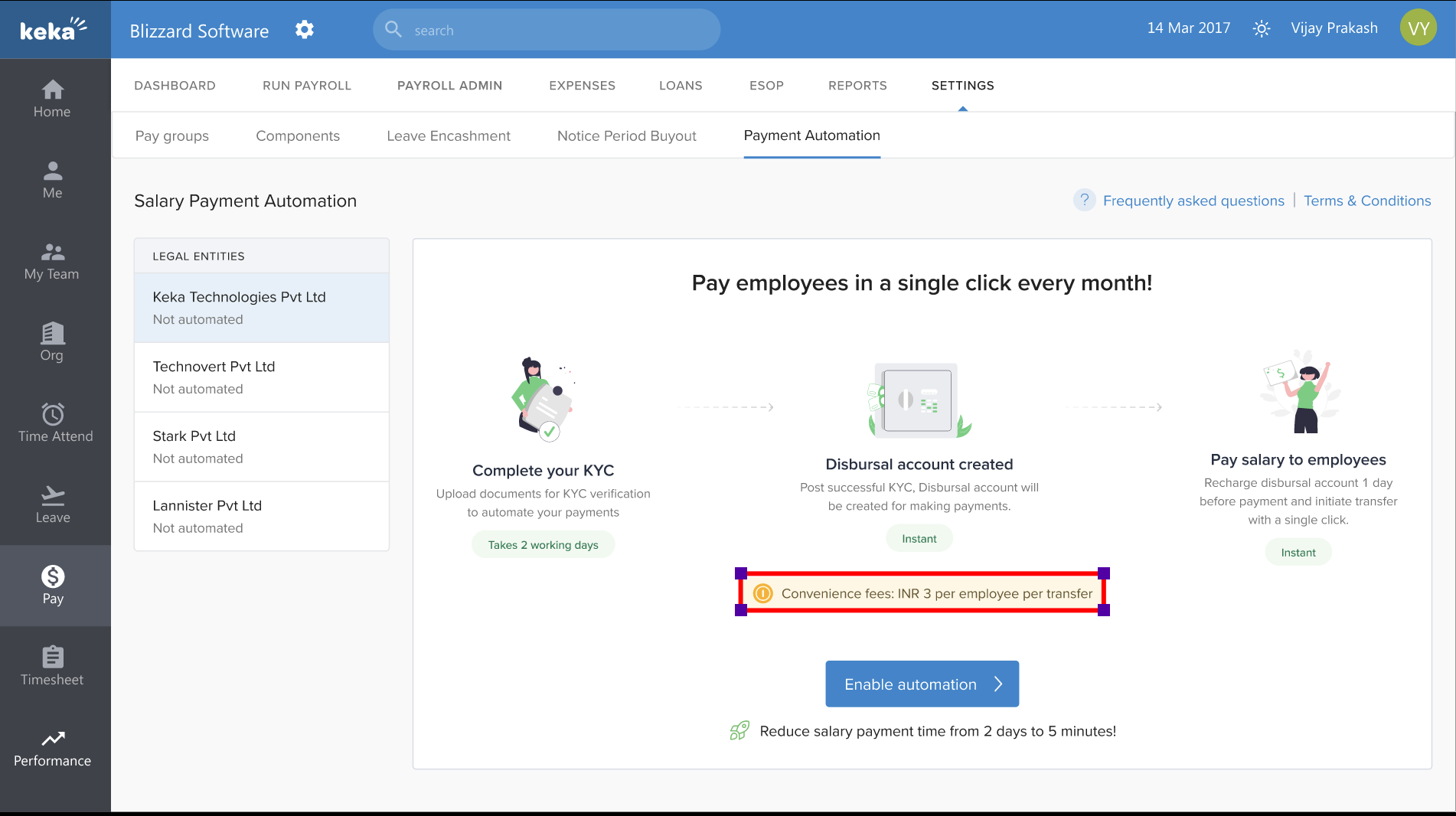 - Convenience fees is not deducted from your billing credits. A separate invoice will be shared with you for convenience charged in case you enable automated salary payments with Keka.