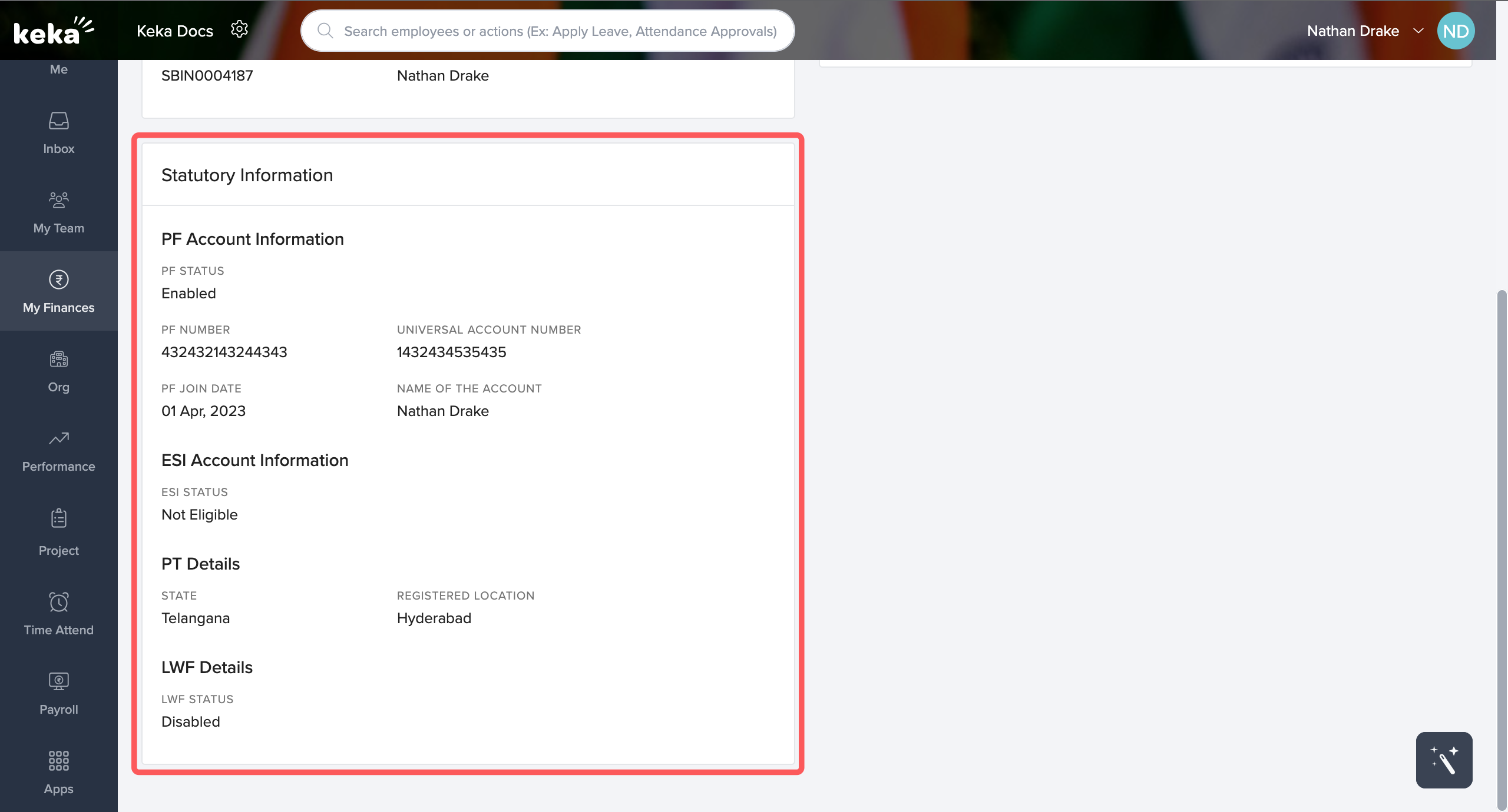 The third card contains Statutory Information relating to PF, ESI, PT, and LWF details as can be seen in the screenshot below.