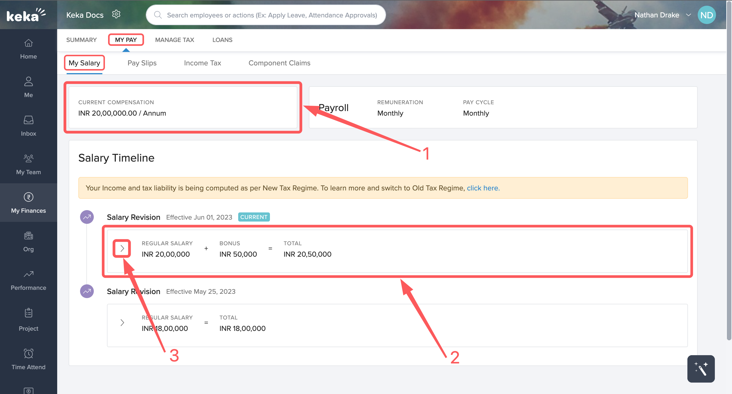 Now, if you click on My Pay, you will be directed to the My Salary tab. Here, at the top of the page, you will be able to view your Current Compensation (1), below that, under Salary Timeline you will be able to view the complete history of your compensation and all the salary revisions that have occurred till that point in time.