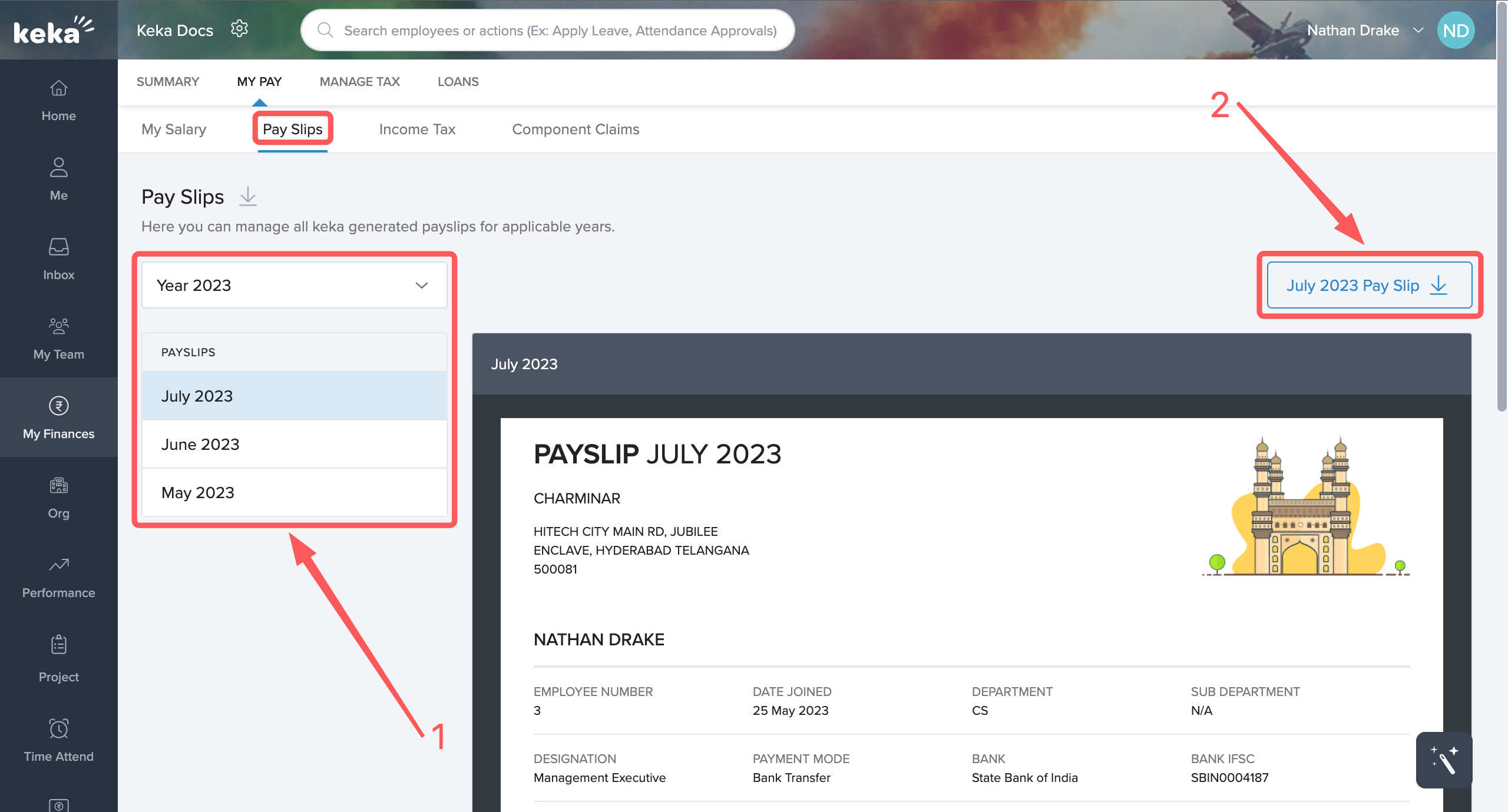 When you click on Pay Slips a page will open up with the latest months payslip displayed. On the left side of the screen, you have the dropdown (1) to select the year and below that you have the options to choose the month for which you wish the payslip to be displayed.