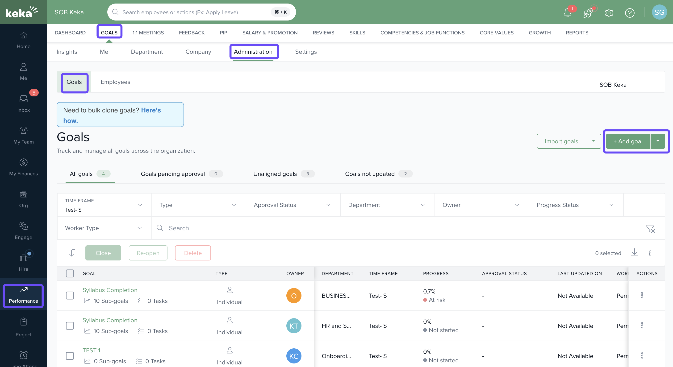 - Go to the Performance section, select Goals, and then click Administration.