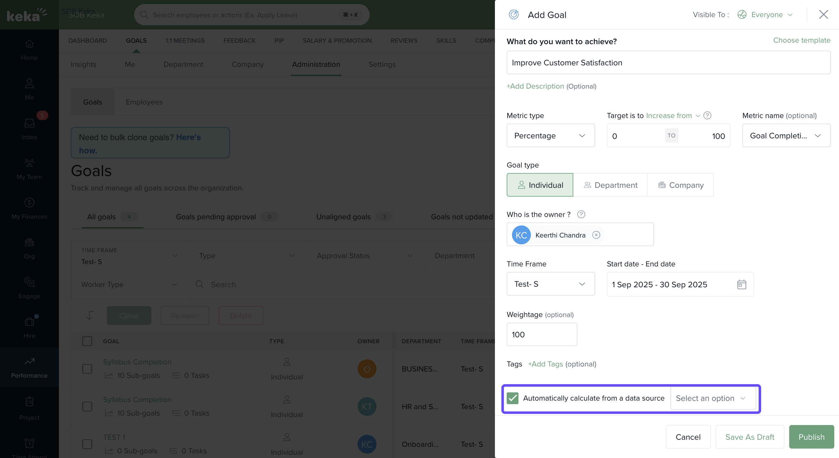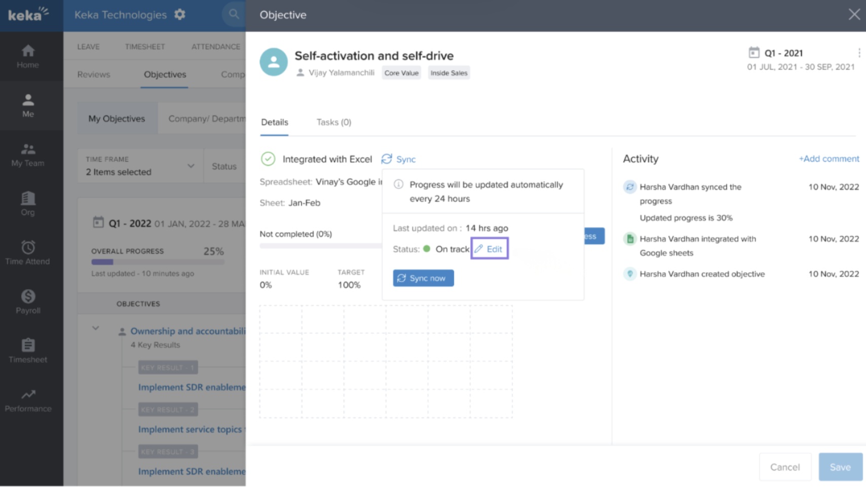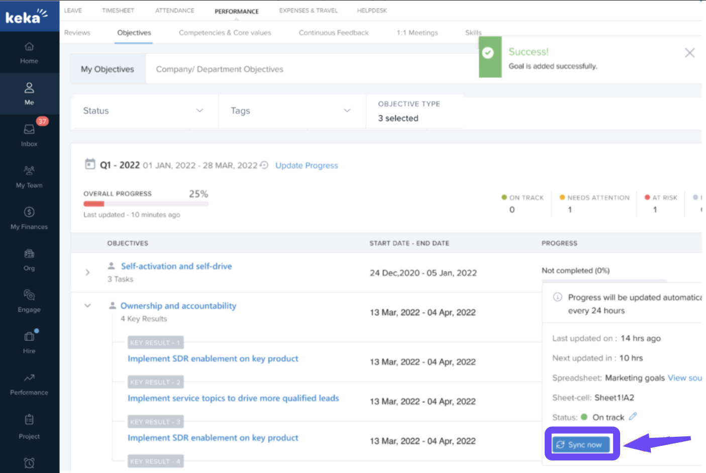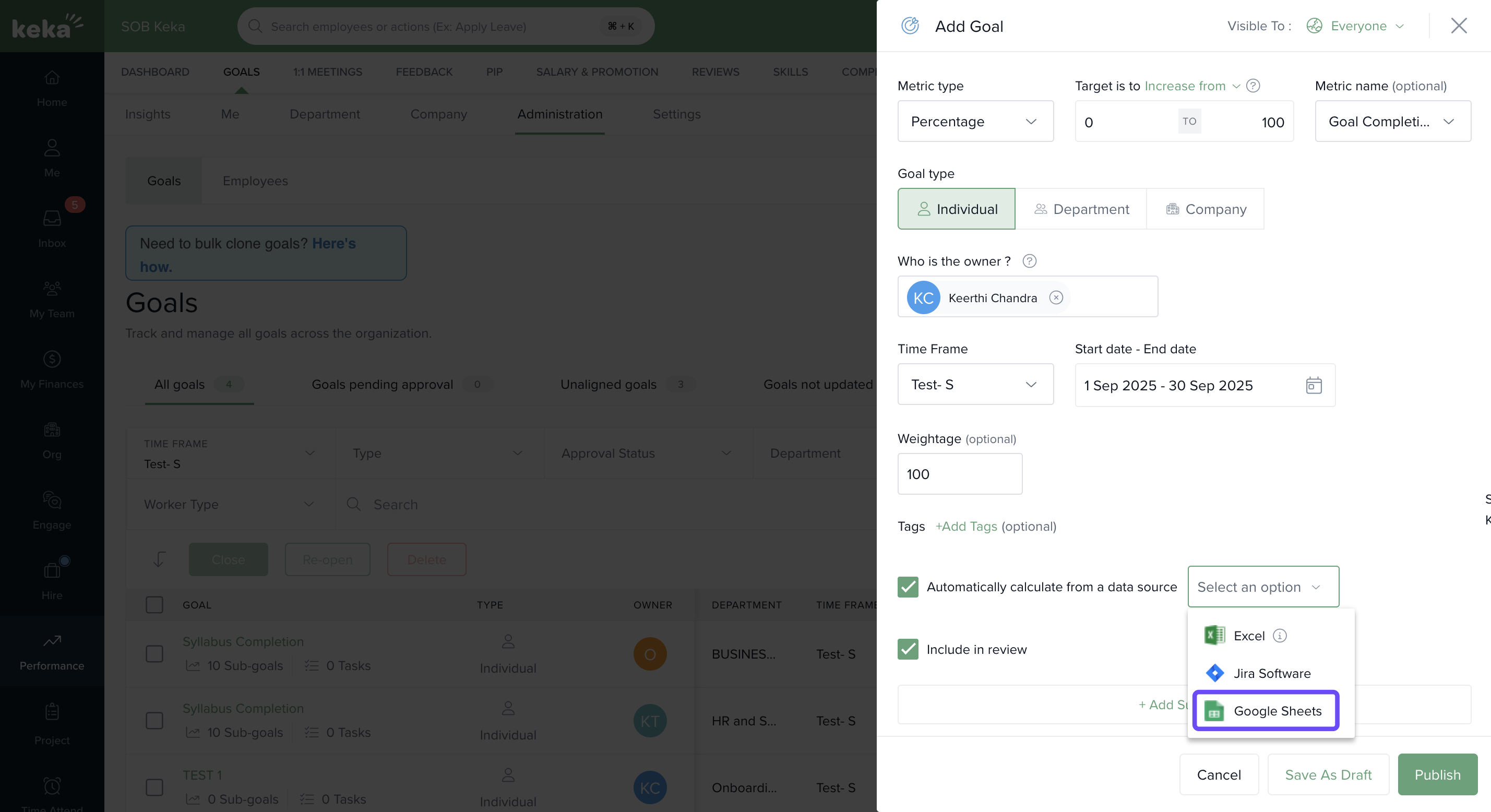 By integrating Google Sheets with Keka’s Performance Module, you streamline how progress is tracked and reported. Whether you’re managing OKRs or individual goals, this integration saves time and ensures accurate, up-to-date performance data.