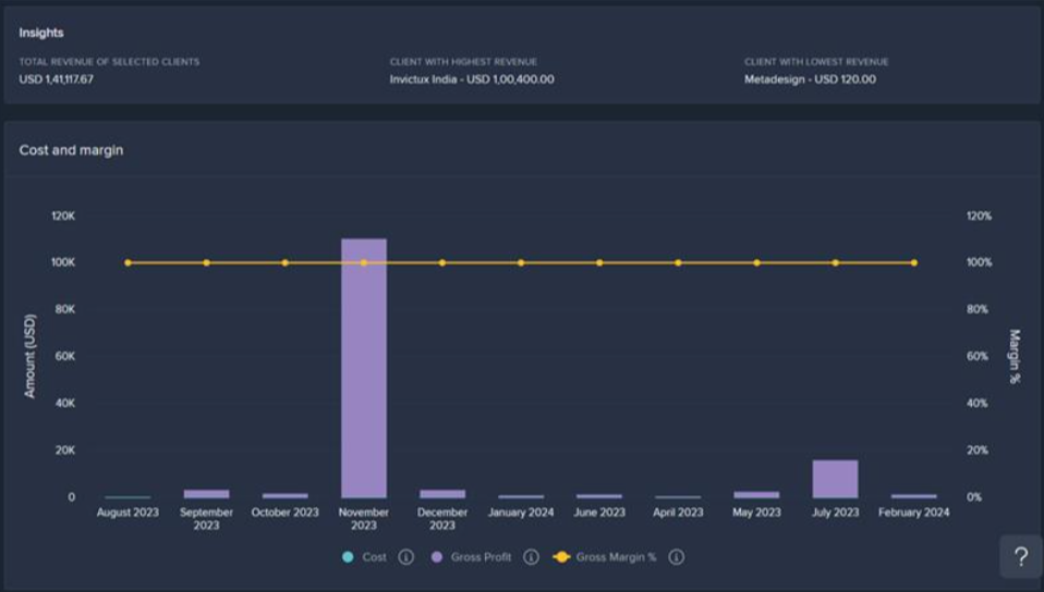 - Timeline of Clients: This bar chart provides a detailed breakdown of monthly, quarterly, or yearly costs, gross profit, and gross margin % for clients within a specified date range. By default, the chart displays data from the past year and only includes clients for whom an invoice has been generated.