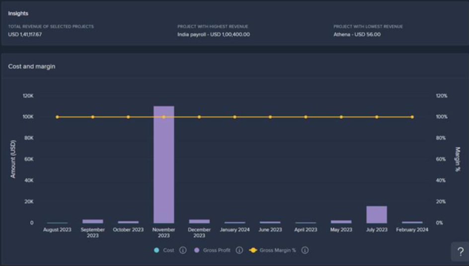 - Timeline of Projects: This bar chart displays the monthly, quarterly, or yearly costs, gross profit, and gross margin % of projects within a specified date range. The default range is set to the past year, and only projects with generated invoices are included in this chart.
