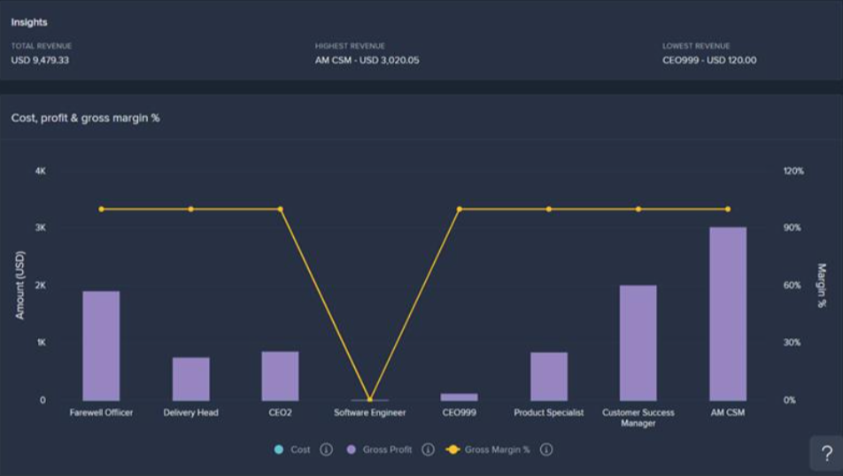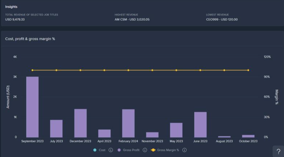 - Timeline of Job Title: The bar chart provides a visual representation of the monthly, quarterly, or yearly costs, gross profit, and gross margin % associated with specific job titles within the chosen date range. This data is generated based on the job titles of employees working on various projects, including their costs and billing information.
