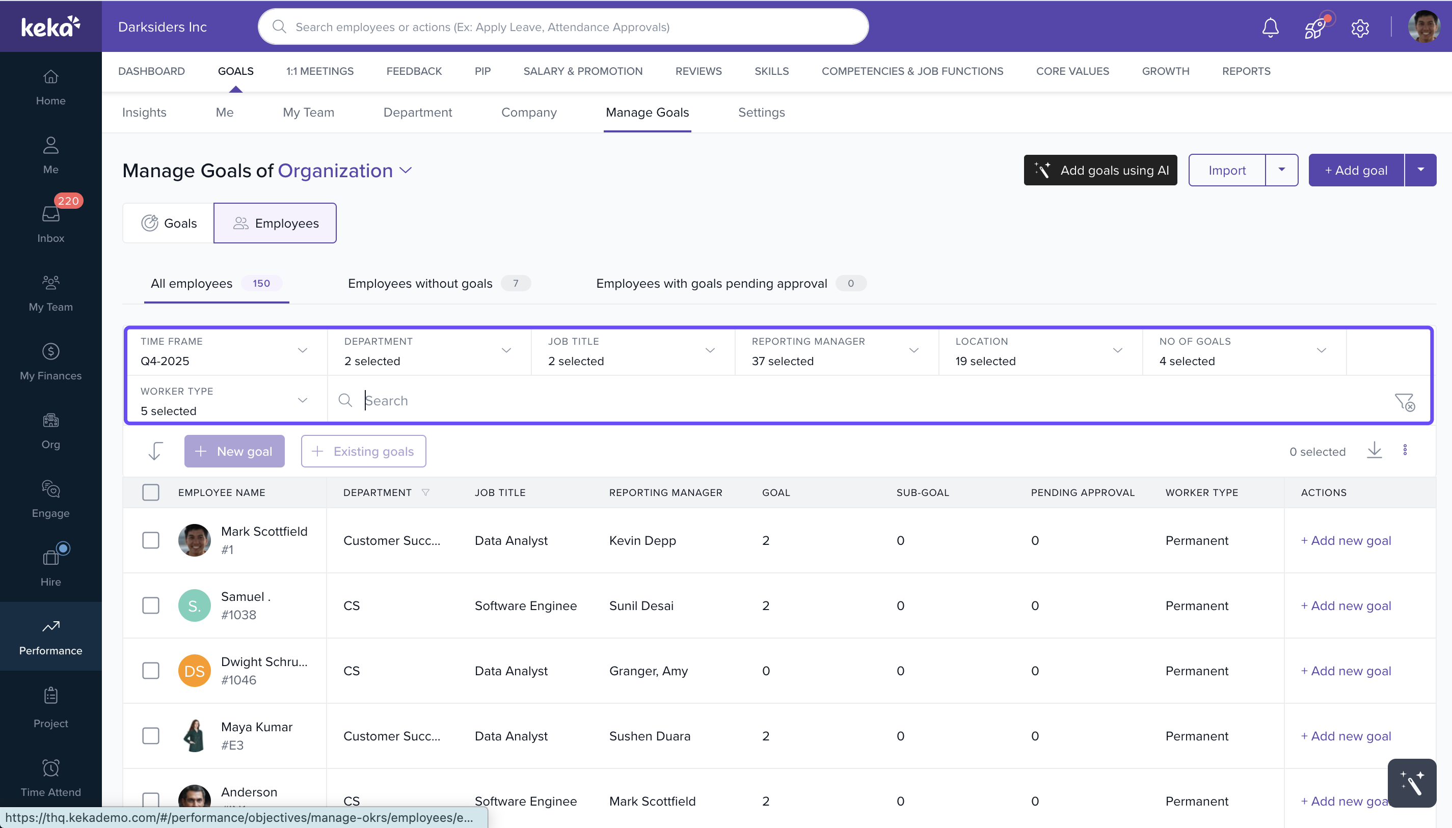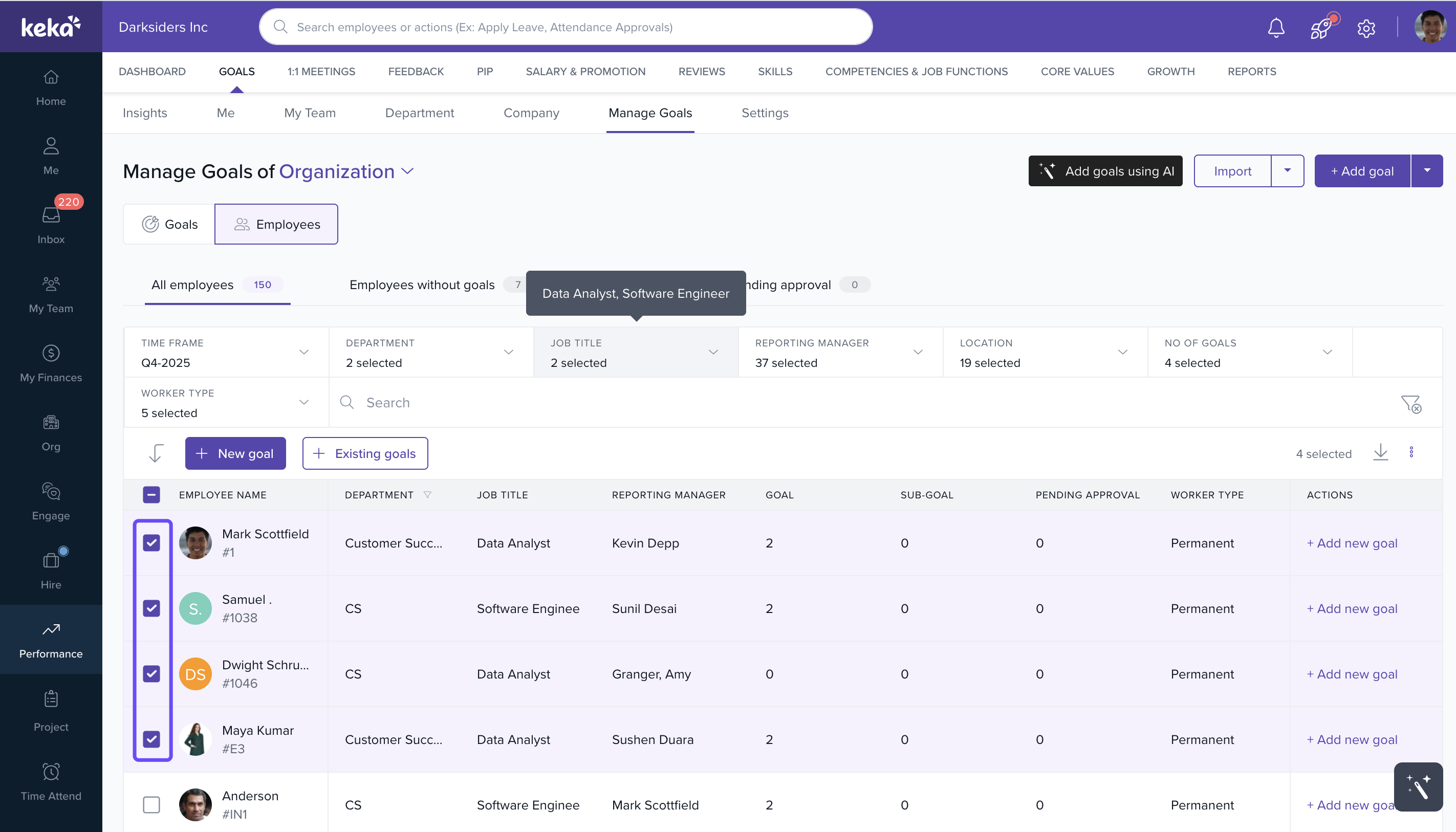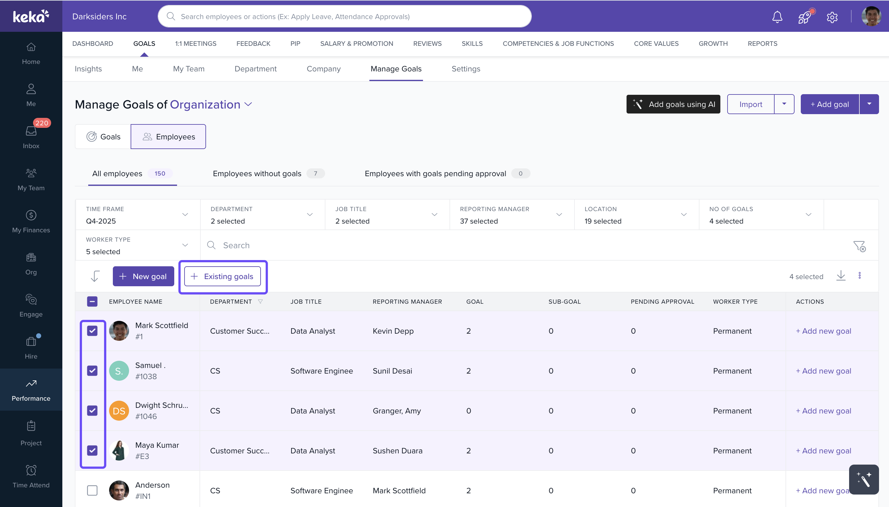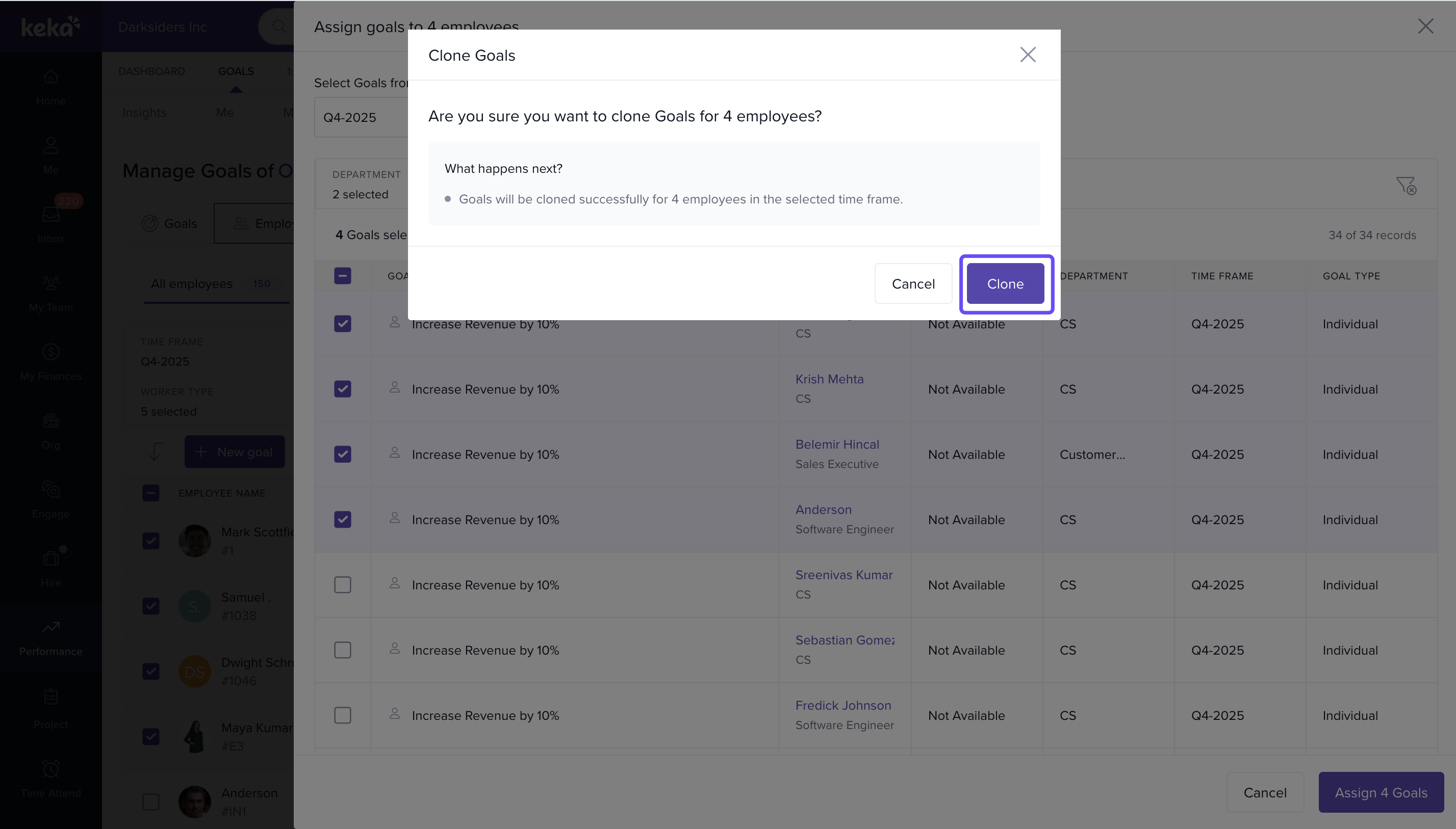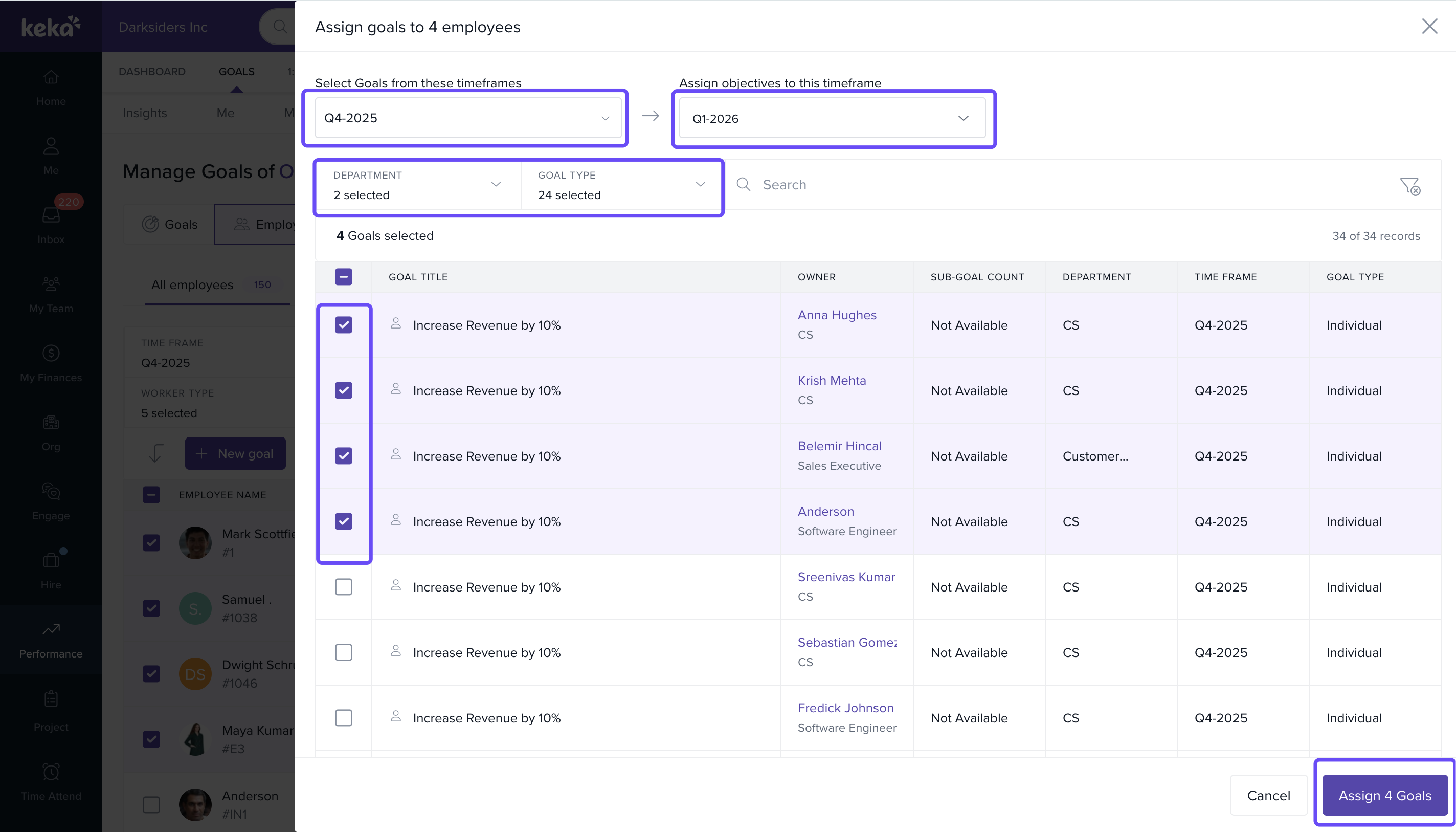 Efficiently managing employee goals is essential for driving both individual and team performance. Keka’s Bulk Assign Goals feature makes it easy to assign objectives to multiple employees at once, either by creating new goals or by cloning existing ones into a different timeframe. This article explains how to use this feature to streamline goal assignment and maintain alignment across your organisation.