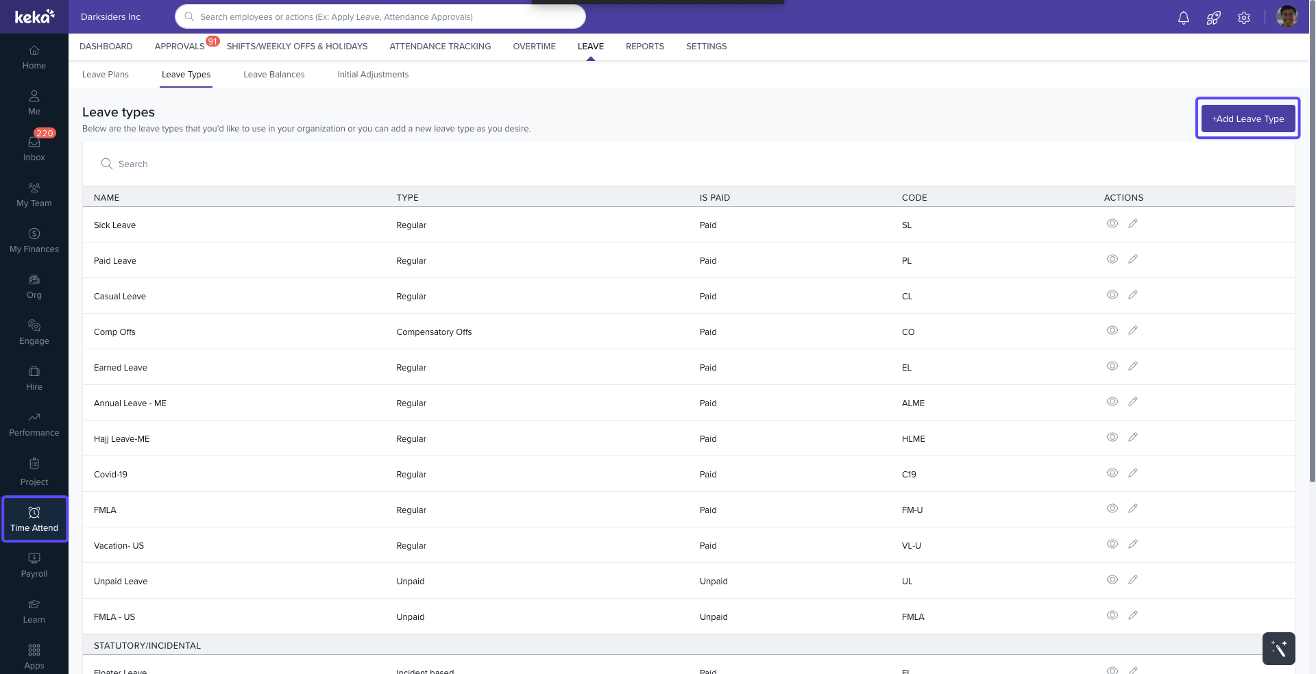 Once the leave plan is created, the next step is to add leave types that your organization offers. Keka allows you to add several leave types, each with its own specific settings.